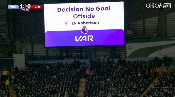 曼城3-0利物浦比赛的第38分钟,范戴克头球破门,但VAR判定罗伯逊越位位置干扰,进球被判无效。