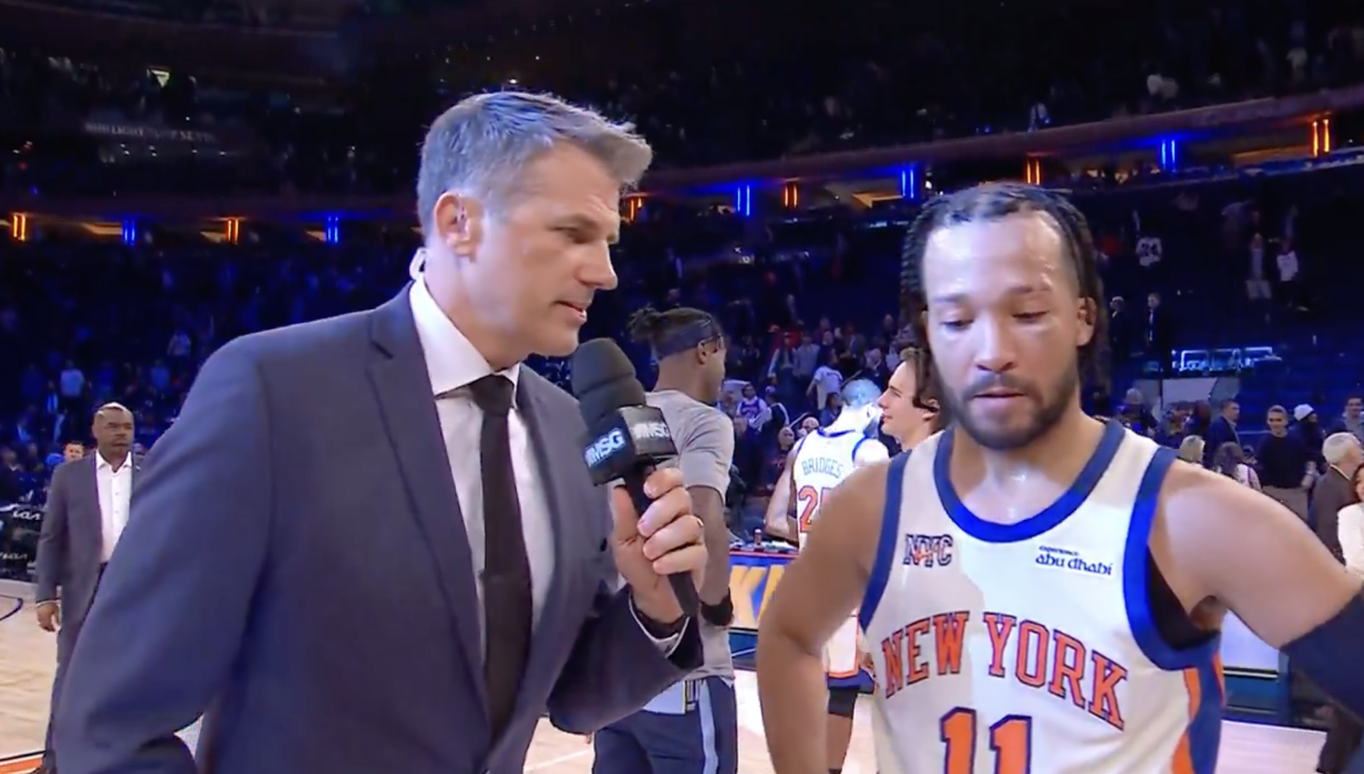 赛后尼克斯球员杰伦-布伦森在接受记者采访时谈到了对本场比赛的看法,布伦森表示:“第四节那表现根本不是我们该有的样子——对手一直在拼,我们却让他们把比赛又追了回来。但没办法,我们得继续拼,不能因为顺风顺水就松懈,这种时候绝对不能自满,得把状态提起来。比赛还剩3分钟左右的时候形势挺关键的,当时他们已经把分差追到10分了。”