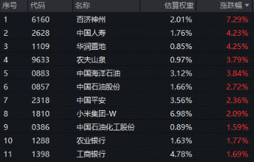 成份股方面,百济神州或受业绩驱动涨超7%,农夫山泉涨3%创阶段新高,小米集团-W、工商银行、农业银行等紧随其后,另一方面,阿里巴巴-W、泡泡玛特现调整跌2%。