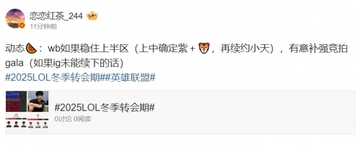 直播吧11月12日讯今日微博爆料人“恋恋红茶”更博透露WBG的转会消息:wb如果稳住上半区(上中确定紫+,再续约小天),有意补强竞拍gala(如果ig未能续下的话)