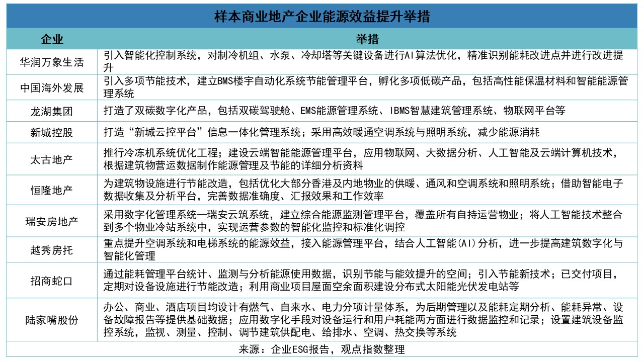 例如,中海为提升既有项目的能源管理效果,积极实施节能降耗设备与节能技术改造,推动能源节约增效。截至2024年末,已完成15个节能改造项目,完成11个项目EMC节能改造项目和4个BOT热源改造项目,每年总计减少用电615万千瓦时。并计划于2025年前推进共计10个自持商业项目的节能改造。