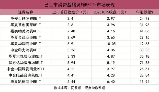 年内涨幅排名前五的除博时招商蛇口产业园REIT外,全部是消费类REITs:嘉实物美消费REIT涨幅45.11%,华夏大悦城商业REIT涨幅40.64%,易方达华威市场REIT涨幅37.70%,华夏首创奥莱REIT涨幅37.63%,华夏金茂商业REIT涨幅38.80%。这些产品的优异表现主要得益于消费复苏、优质资产稀缺性以及专业运营带来的资产增值。
