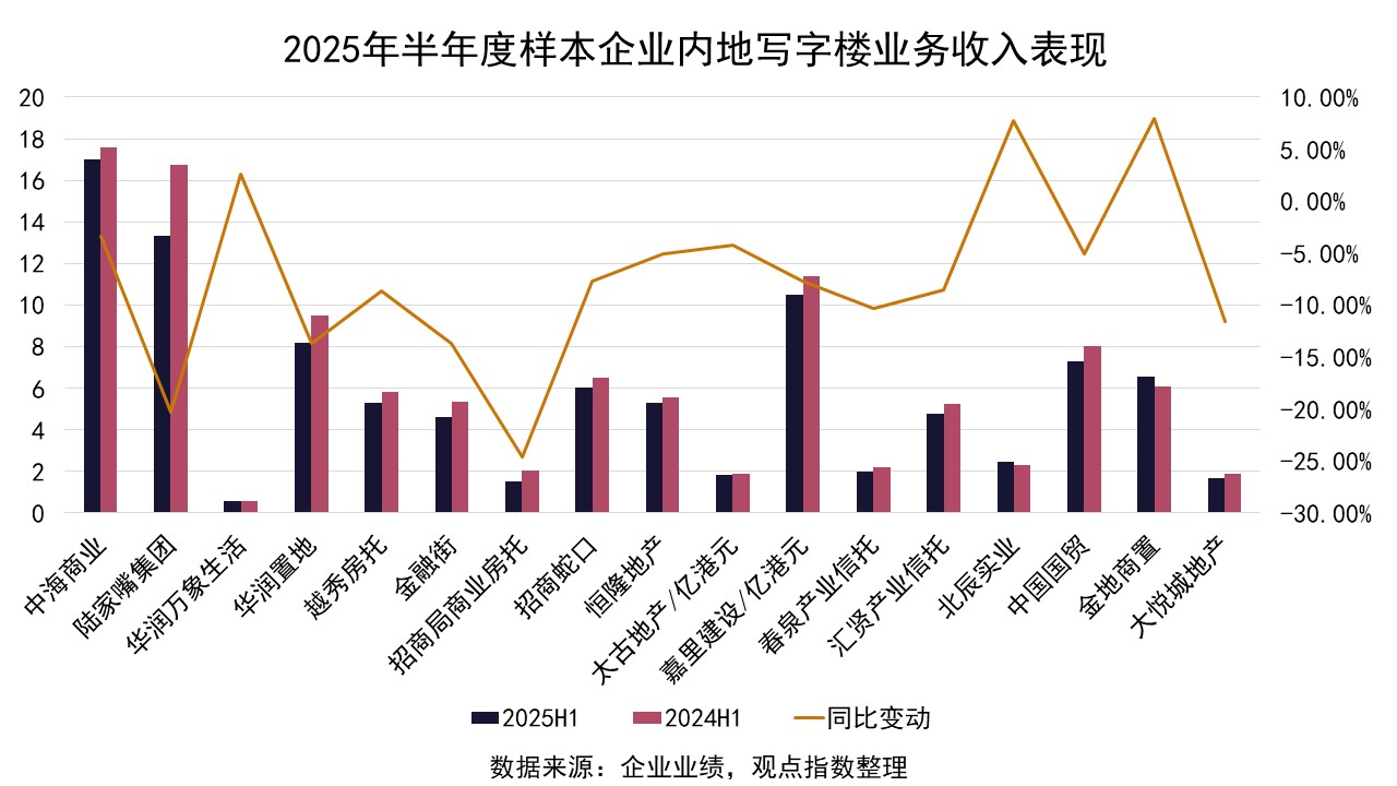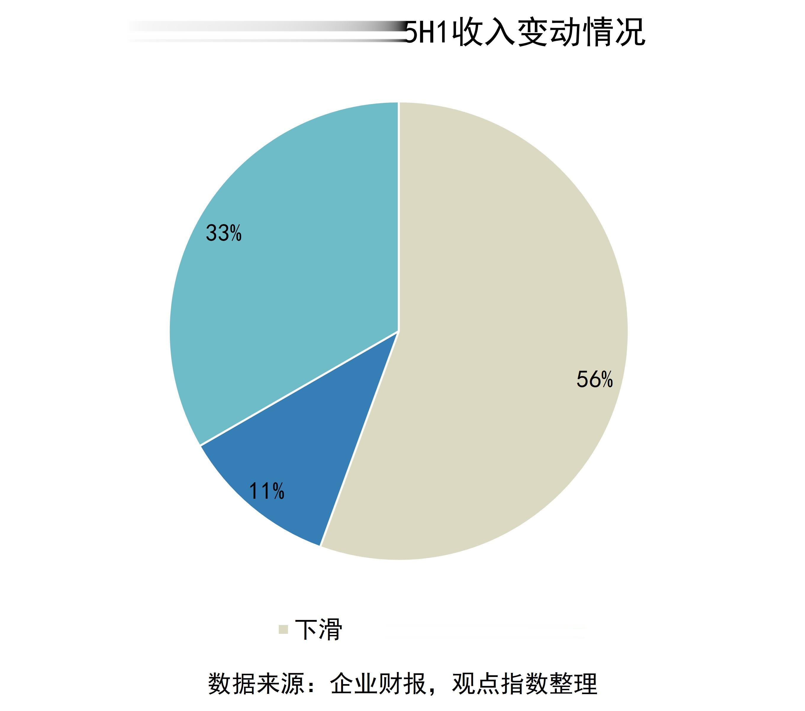 为深入研究企业的表现,观点指数剔除样本池中规模较小且非典型的个体,选取了18个代表性企业。其中约56%的企业2025年上半年录得收入同比下滑,11%的企业收入相对持平,余下33%的企业录得收入增长。