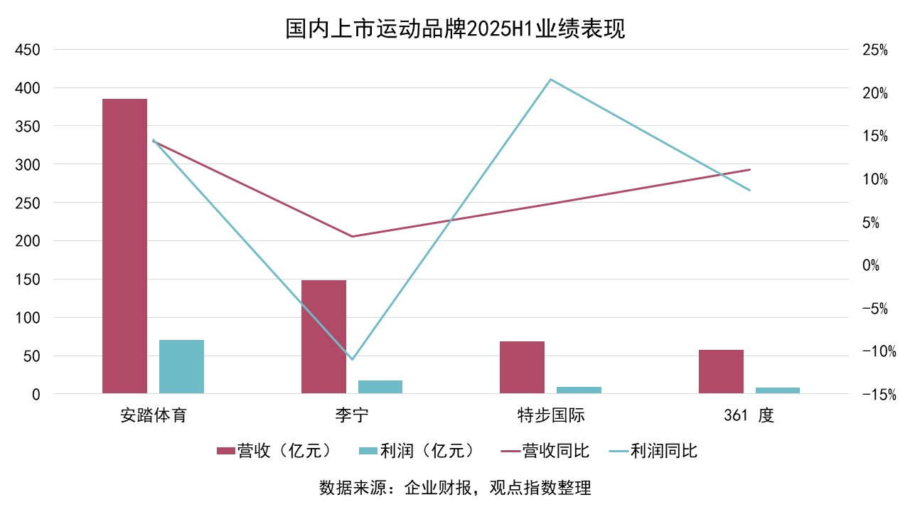 户外运动方面,国内四大运动品牌中,安踏头部地位依然稳固,2025上半年的营收达到385.4亿元,同比增长14.3%,营收规模超过了李宁、特步与361度三家企业的总和。