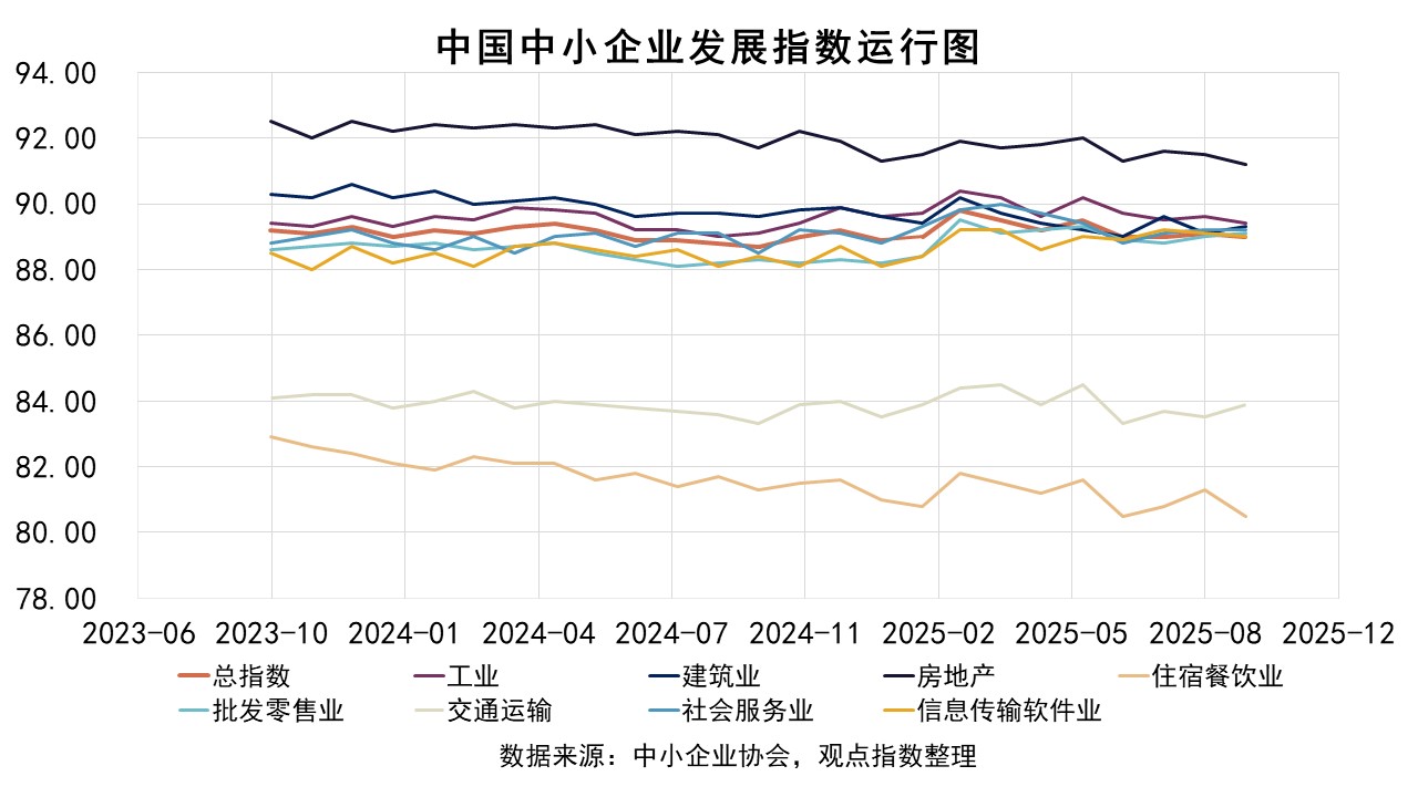据中小企业协会发布的最新数据显示,2024年至2025年9月期间,中国中小企业发展总指数(SMEDI)最高点为2025年2月的89.8,最低点为2024年9月的88.7,期间总指数在波动中逐步趋稳,政策托底效应显著,复苏基础仍需巩固。