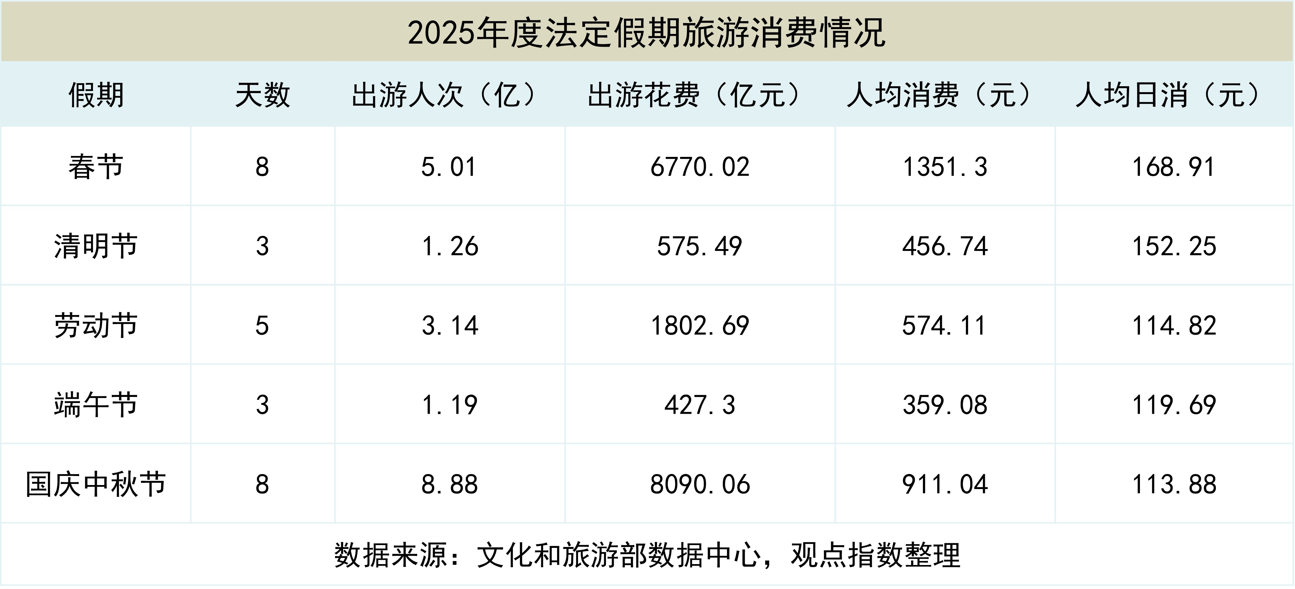 以重点节假日为观察窗口,据文化和旅游部数据中心测算,最新的国庆中秋假日8天,全国国内出游8.88亿人次,较2024年国庆节假日7天增加1.23亿人次;国内出游总花费8090.06亿元,较2024年国庆节假日7天增加1081.89亿元。