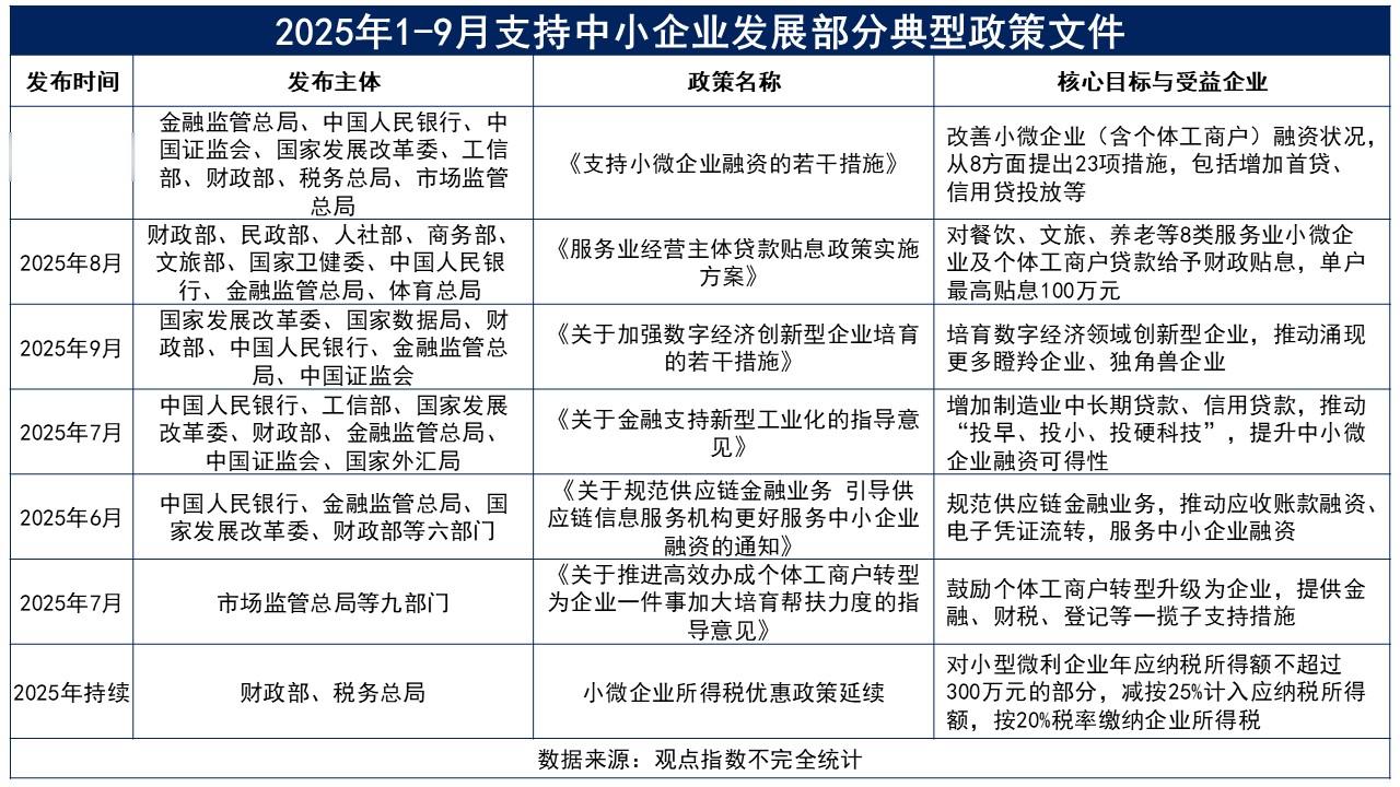 据观点指数不完全统计,2025年1-9月期间,国家和地方层面对中小企业发展的政策支持文件主要覆盖融资支持、创新培育、转型帮扶、税负减免的全链条政策体系,为中小企业发展提供强力支撑。