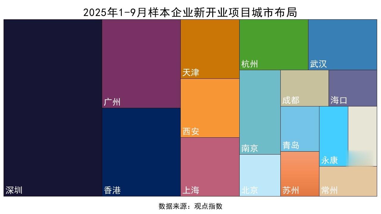 据观点指数不完全统计,2025年1-9月期间,样本企业新开店项目布局城市覆盖深圳、上海、广州、北京、天津、杭州、成都、武汉、西安、南京、苏州、常州等多个重点城市。