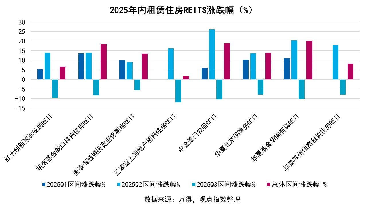 三季度出现明显回调,平均跌幅-9.07%,二级市场呈现“无差别下跌”的态势,市场对保租房REITs短期运营持谨慎态度。