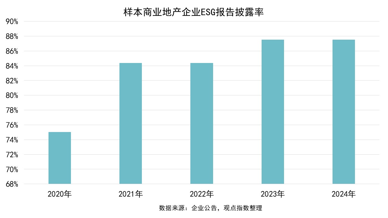 商业地产领域,观点指数监测下的40家样本企业(A股+港股)2024年度ESG披露率为87.50%,与上年度保持同样水平。其中,头部企业对实践ESG的重视度更高,在资产全生命周期的各个阶段深度融合这一理念,以实现从被动合规向价值创造的主动转变。
