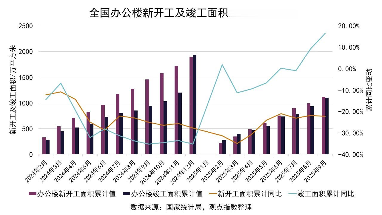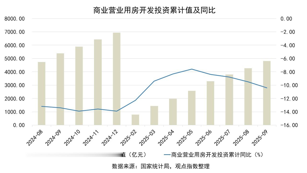 从投资方面的数据来看,商业营业用房2025年1-9月投资额4806.50亿元,同比下降10.4%,降幅较2024年同期收窄3个百分点,虽然投资额仍在收缩,但收缩速度有所放缓,市场对商业营业用房的预期边际改善,政策刺激(如消费复苏、商业租金补贴)开始显现效果。