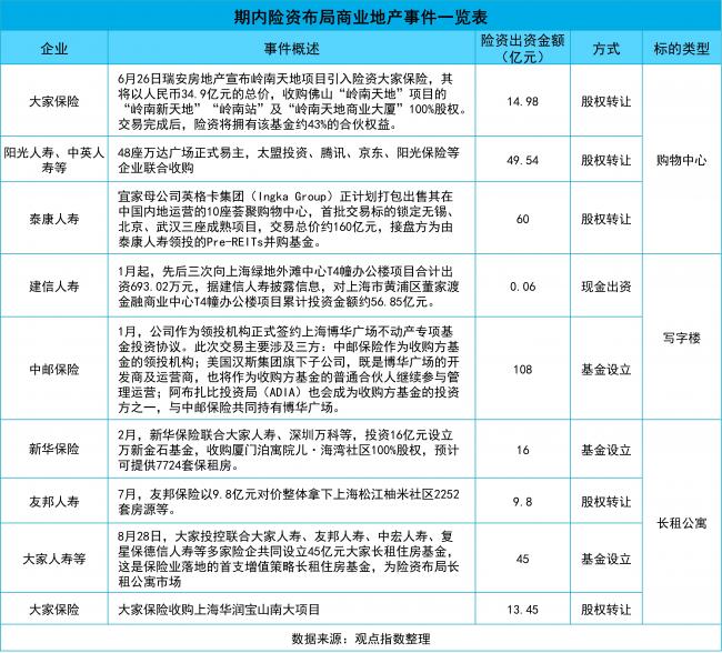 观点指数认为,险资布局背后是“资产荒”背景下对稳定现金流资产的需求,以及政策对险资布局不动产市场领域的支持。从2020年9月,原中国银保监会发布《中国银保监会关于优化保险机构投资管理能力监管有关事项的通知》提出,具备“不动产投资管理能力”的保险公司,可采取直接投资方式进行不动产投资,其他保险公司则可通过购置自用性不动产及投资不动产企业股权等方式进行直接投资。