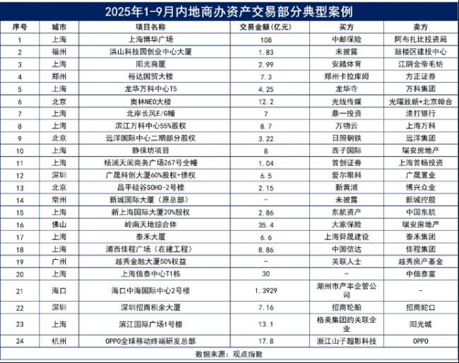 聚焦买家层面,观点指数注意到,今年商办资产交易主体更集中,尽管整体上外资撤离,但金融机构、科技企业、政府平台公司、头部产业企业仍在谨慎入场,共同构成了市场的主要参与力量,中小投资者因风险承受能力低逐步退出。