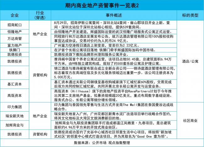 据不完全统计,报告期内观点指数监测下的样本资管机构和地产企业共录得39起商业地产资管事件,主要围绕商业地产项目的交易和管理运营进行,标的资产主要是购物中心、奥特莱斯、写字楼、酒店、长租公寓、社区商业等。