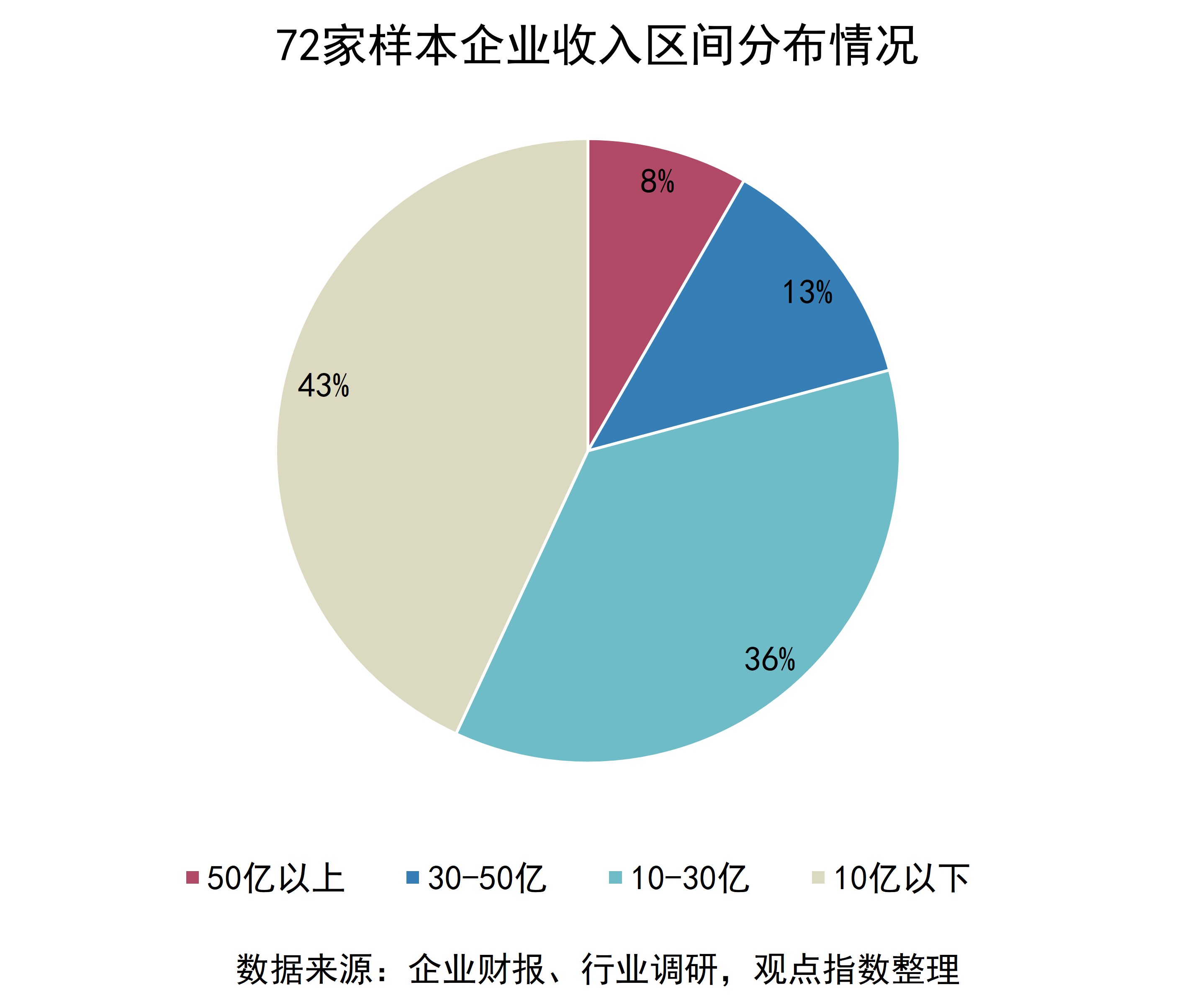 观点指数就“商业地产企业表现”研究成果的样本企业进行观察,发现10亿元以下的企业占比最大,为43%;其次是10-30亿元收入的企业,约占36%;再则是30-50亿元收入的企业,占比接近13%;50亿元以上收入的企业,占全部样本企业的比例为8%。