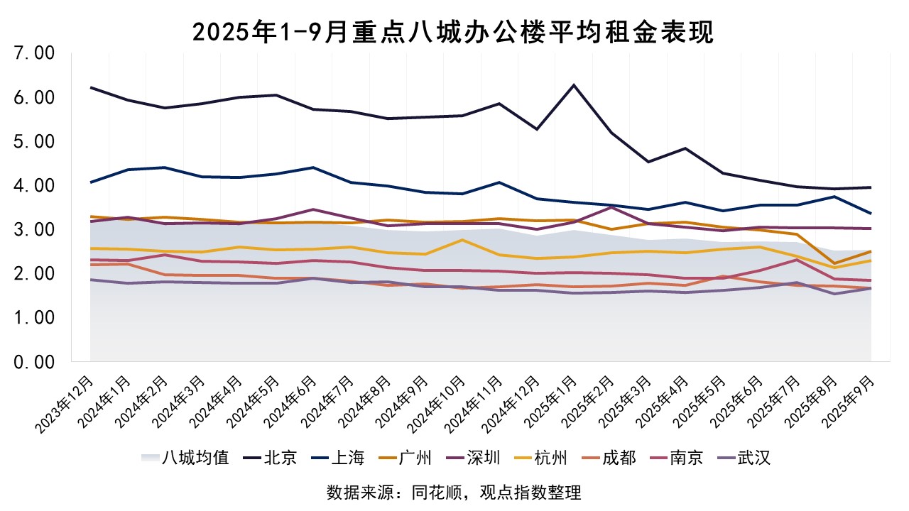 办公租赁市场表现上,观点指数筛选重点八城(包括北京、上海、广州、深圳、杭州、成都、南京以及武汉),监测办公物业平均租金的走势情况。