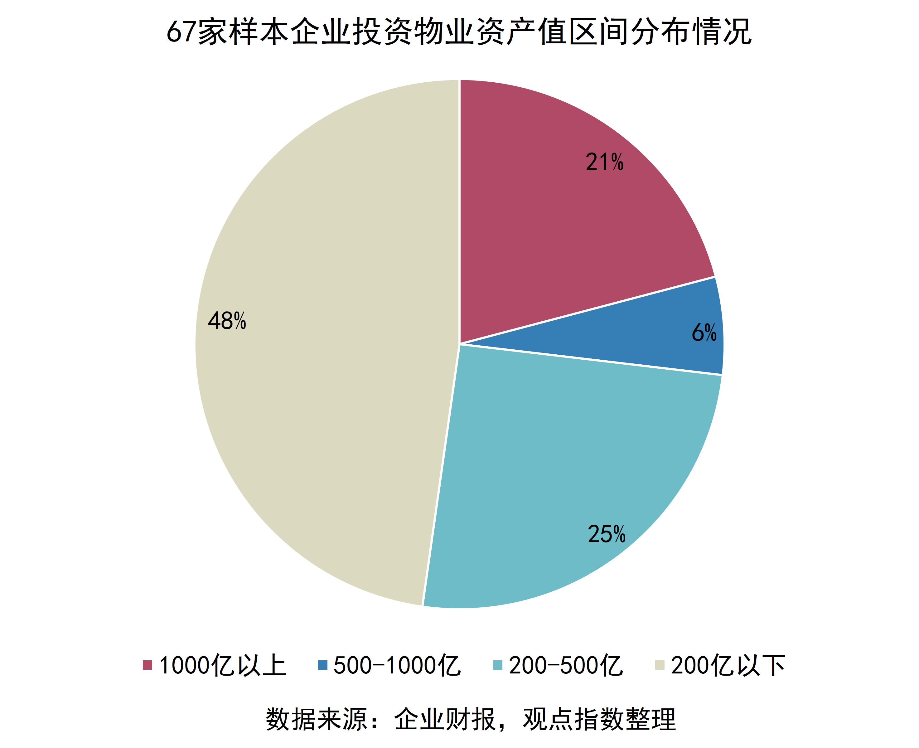 投资物业资产值方面,样本商业地产企业中,资产值在200亿元以下的企业占比48%,200-500亿元的企业占比25%,500-1000亿元的占比约6%,1000亿元以上的企业占比为21%。