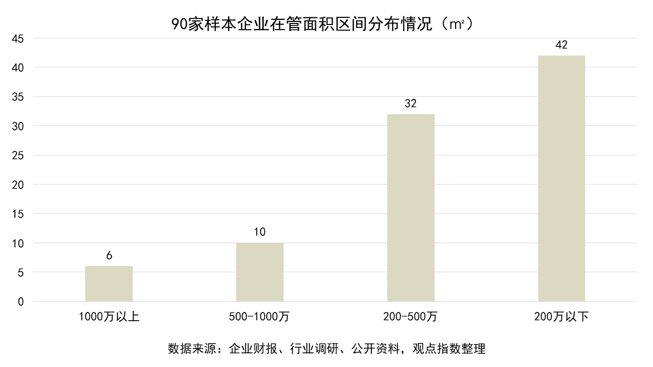 规模方面,在商业地产样本企业中,在管面积在200万㎡以下的企业达到42个,其次是200-500万㎡元的企业,32家;再则是500-1000万㎡的企业,10家,1000万㎡以上收入的企业则有6家。