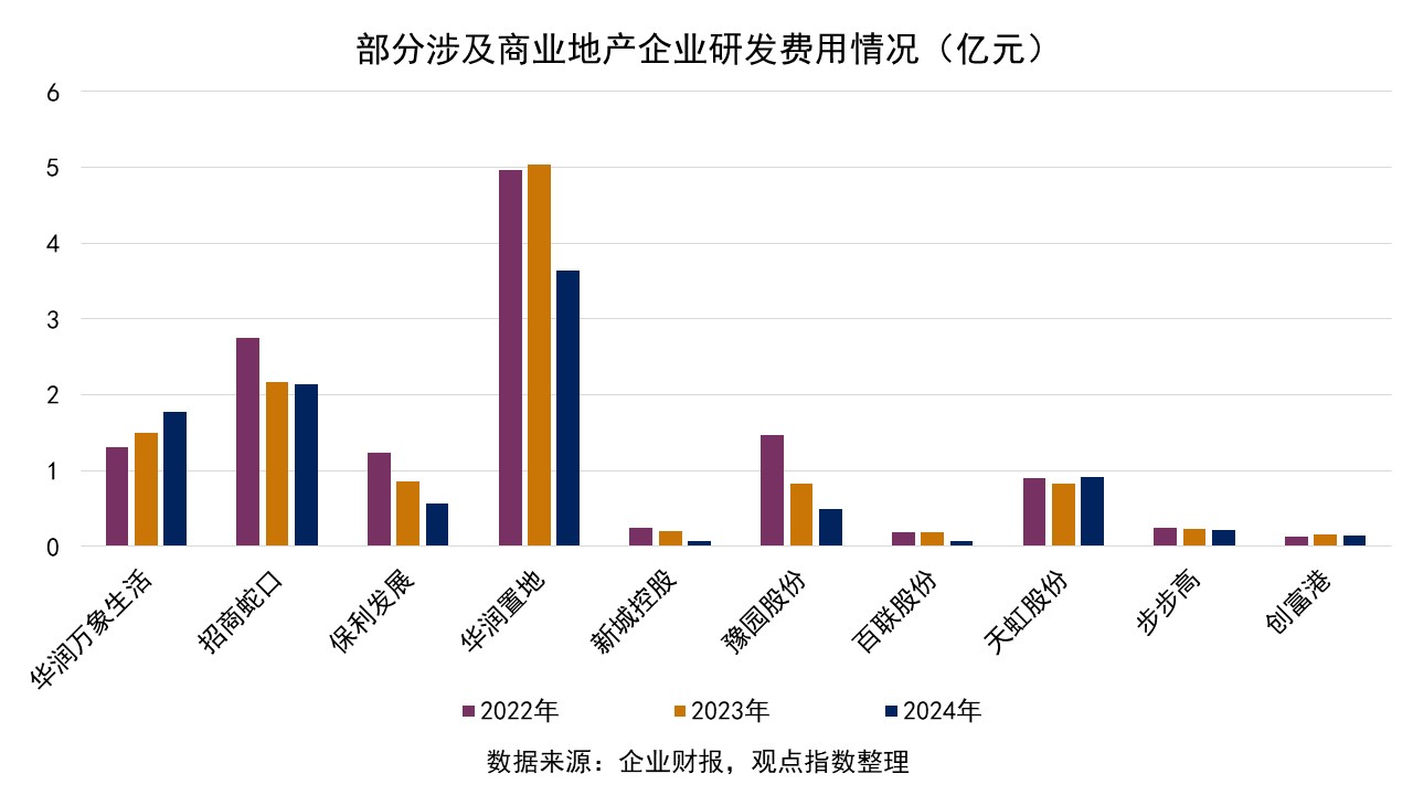 从企业在科技领域的投入来看,多数涉足商业地产的企业研发费用延续下滑,投入金额占营业收入的比例也仅在1%左右,不过,头部企业研发费用的绝对金额更大,呈现出更积极的数字化转型动力。
