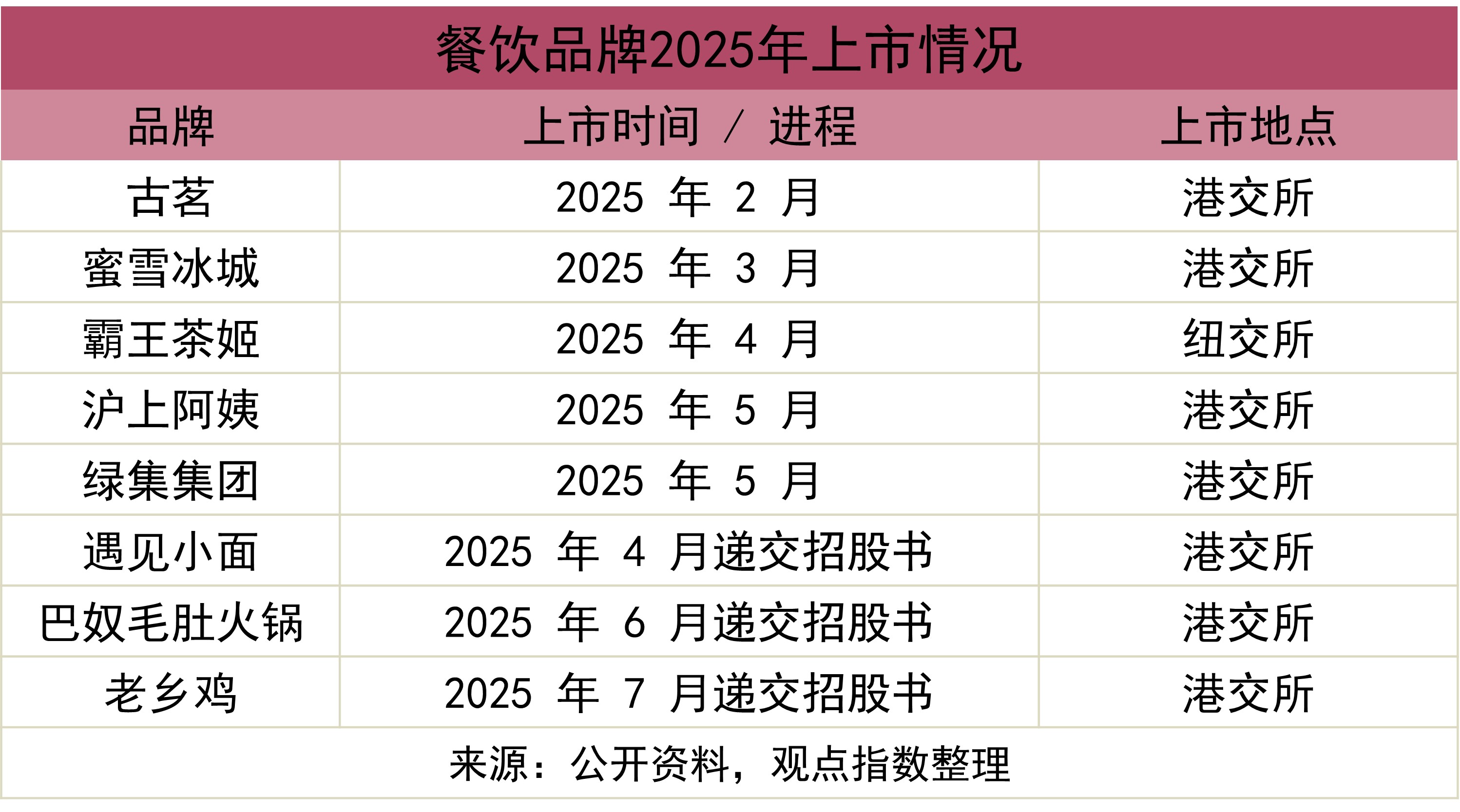餐饮方面,2025年蜜雪冰城、古茗、沪上阿姨、绿茶集团等企业陆续在港交所挂牌上市,霸王茶姬则成功登陆美股。与此同时,遇见小面、巴奴毛肚火锅、老乡鸡等企业也正在冲刺港股IPO,餐饮行业迎来了上市潮。