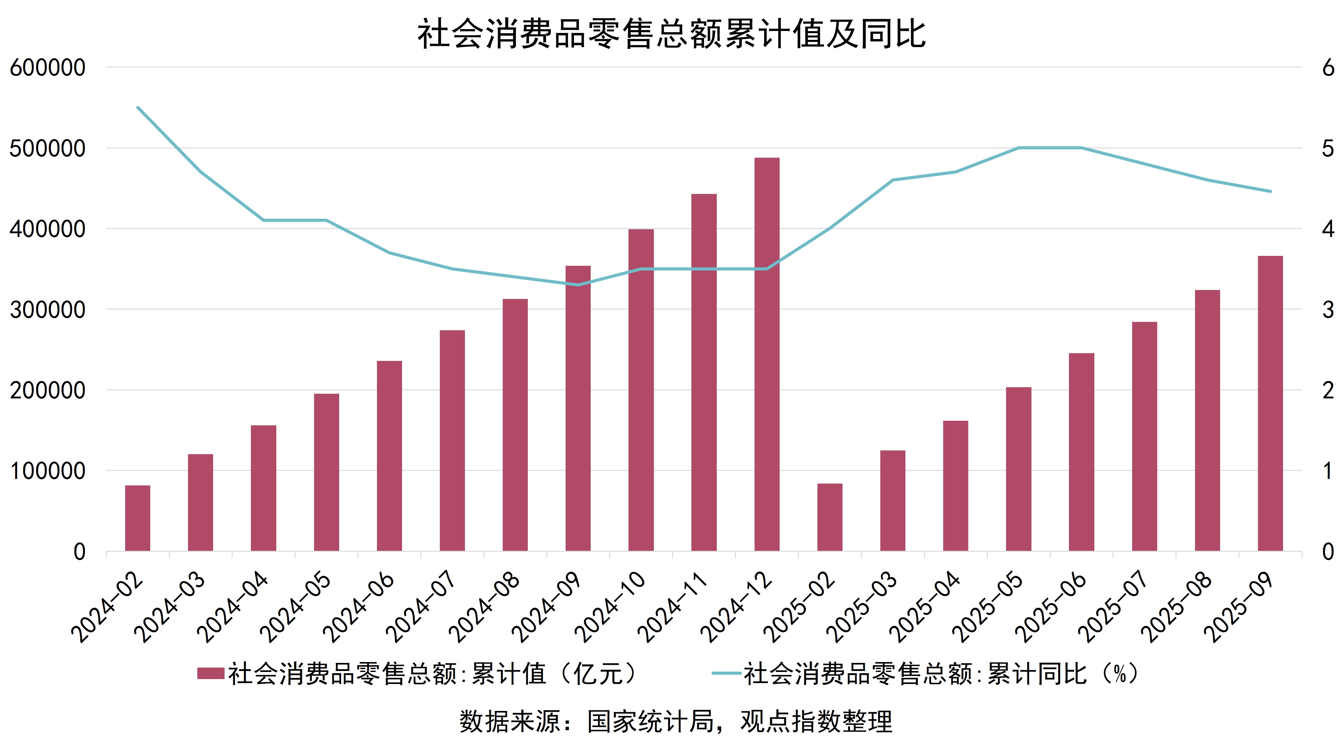 在扩大服务消费系列政策措施的带动下,2025年消费市场呈现温和复苏的态势。社会消费品零售总额保持平稳增速,累计增幅在4%-5%之间,反映了消费市场的内生动力逐步增强。2025年1—9月份,社会消费品零售总额的累计值达到365877亿元,累计增速为4.46%。