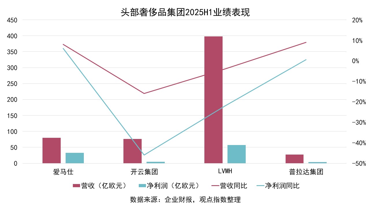 同期,LVMH集团全球最大奢侈品集团,2025上半年营收398.1亿欧元,同比下降4%;营业利润下滑15%至90.12亿欧元,净利润下跌22%。开云集团同样出现下滑,营收76亿欧元,同比下降16%,净利润下跌46%至4.74亿欧元。