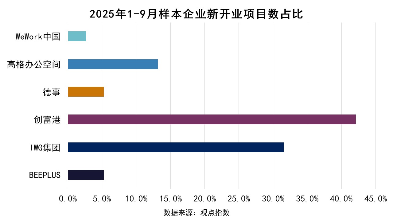 其中创富港和IWG集团新开办公中心网点数居前,两者合计新开项目数占比超70%,市场资源与活跃度向少数玩家集中。