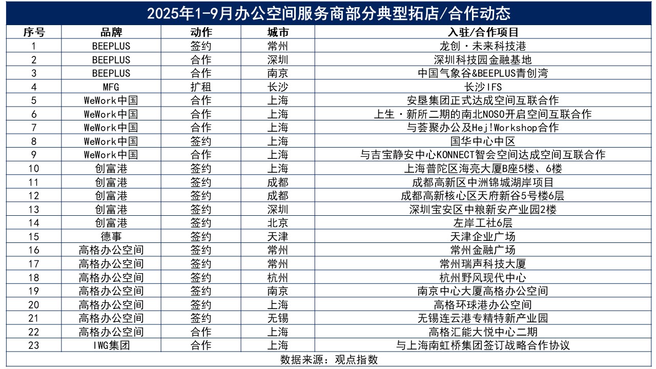 开店之外,2025年1-9月,IWG集团、BEEPLUS、MFG、WeWork中国、创富港、德事、高格办公空间以及IWG集团等样本企业,均有对外拓店或合作的动态。