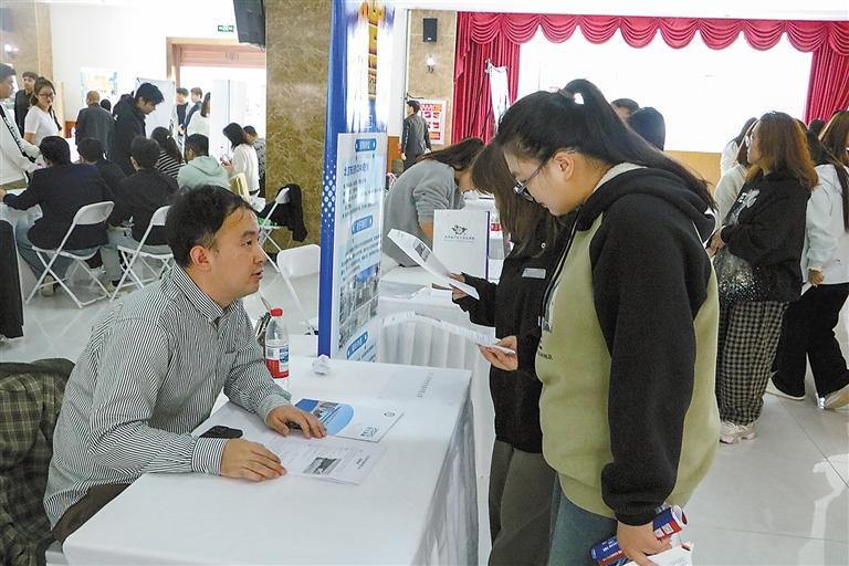 图为学生与招聘企业沟通交流,了解岗位方向。本报通讯员陈丽娜摄