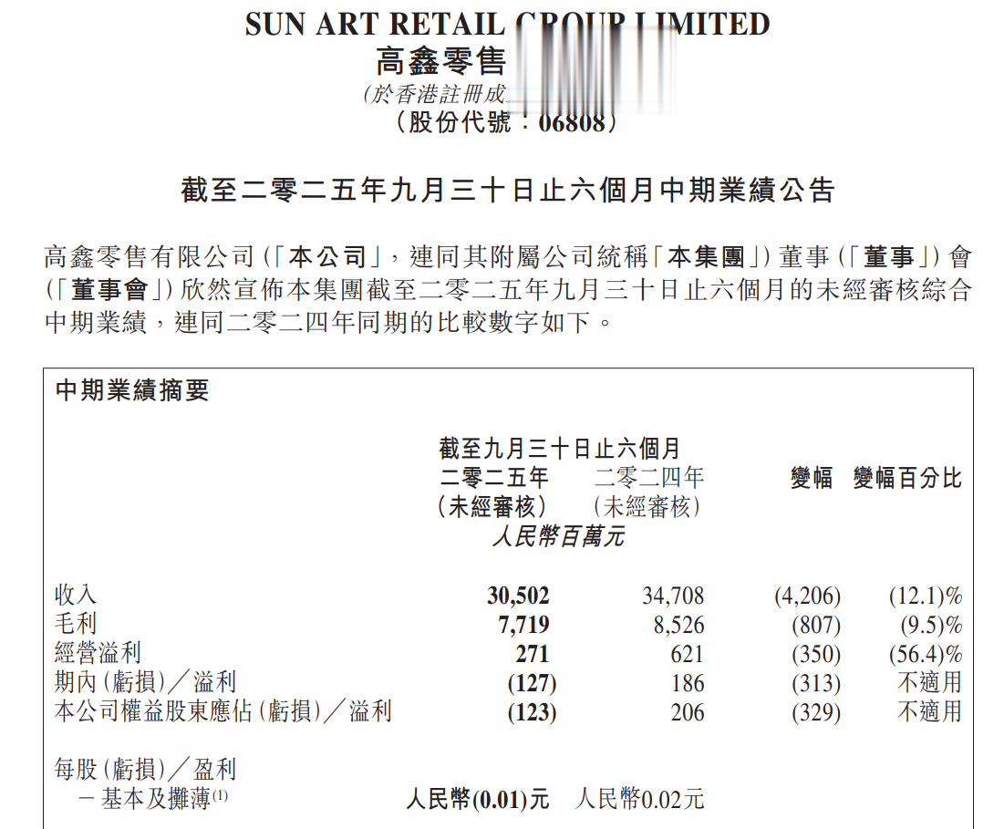 新华财经上海11月12日电(记者魏雨田)11月11日晚,大润发母公司高鑫零售有限公司(以下简称“高鑫零售”)披露了截至2025年9月30日的六个月中期业绩。报告期内,公司实现收入人民币305.02亿元,毛利率25.3%,同比提升0.7个百分点;截至期末,高鑫零售共运营462家大卖场、32家中型超市及7家M会员店。
