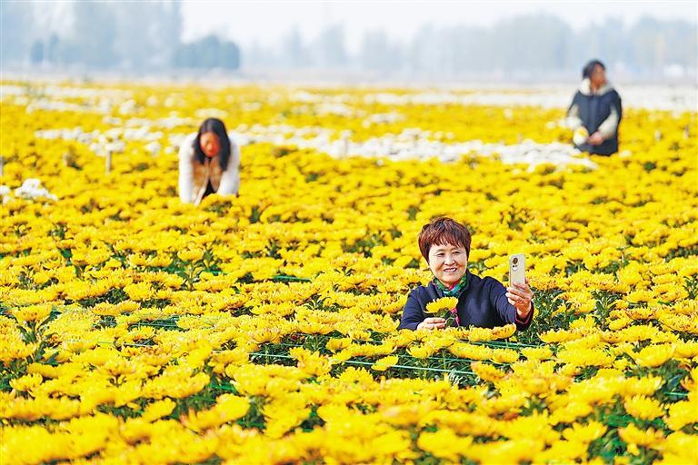 图为在大城县广安镇李王只堡村菊花园内,游客正在赏花拍照。