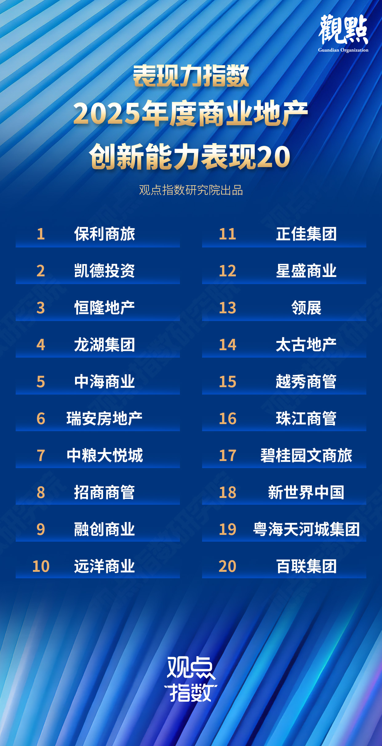 "2025年度商业地产创新能力表现20",综合考量了企业的资本、模式、设计等多个方面创新作为,以创新性为核心,盘点出一批独具匠心,洞察行业发展趋势,引领行业发展的优秀企业。