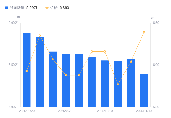 日期A股户数(户)流通A股户均持股数(股)户均持股市值(万元)2025-11-105987318992.2012.142025-10-316828616652.3110.062025-10-206749816846.729.722025-10-106772216791.0010.342025-09-306961216335.1110.062025-09-207148115908.009.352025-09-197148115908.009.352025-09-107296115585.319.462025-08-318135213977.778.882025-08-208396813542.308.03
