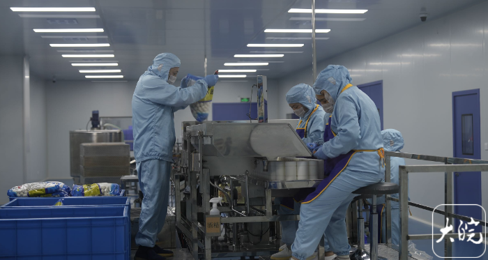 在公司的展示墙上,淮南牛肉汤、酸辣粉、麻辣烫、螺蛳粉等各式网红速食产品琳琅满目。除了一包包美食,一条条生产线是保证产品安全优质的关键。