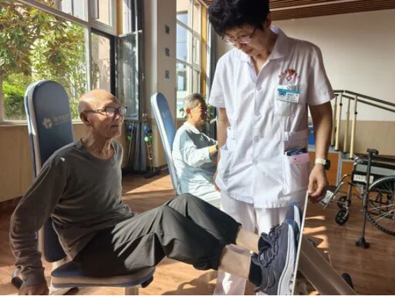 在该中心的康养楼,84岁的时述礼正在康复师的指导下进行下肢训练。因脑中风导致行动不便的他,经过专业康复训练,如今已经能够拄着拐杖行走。“夜里能自己上厕所了!”老人满意地说。
