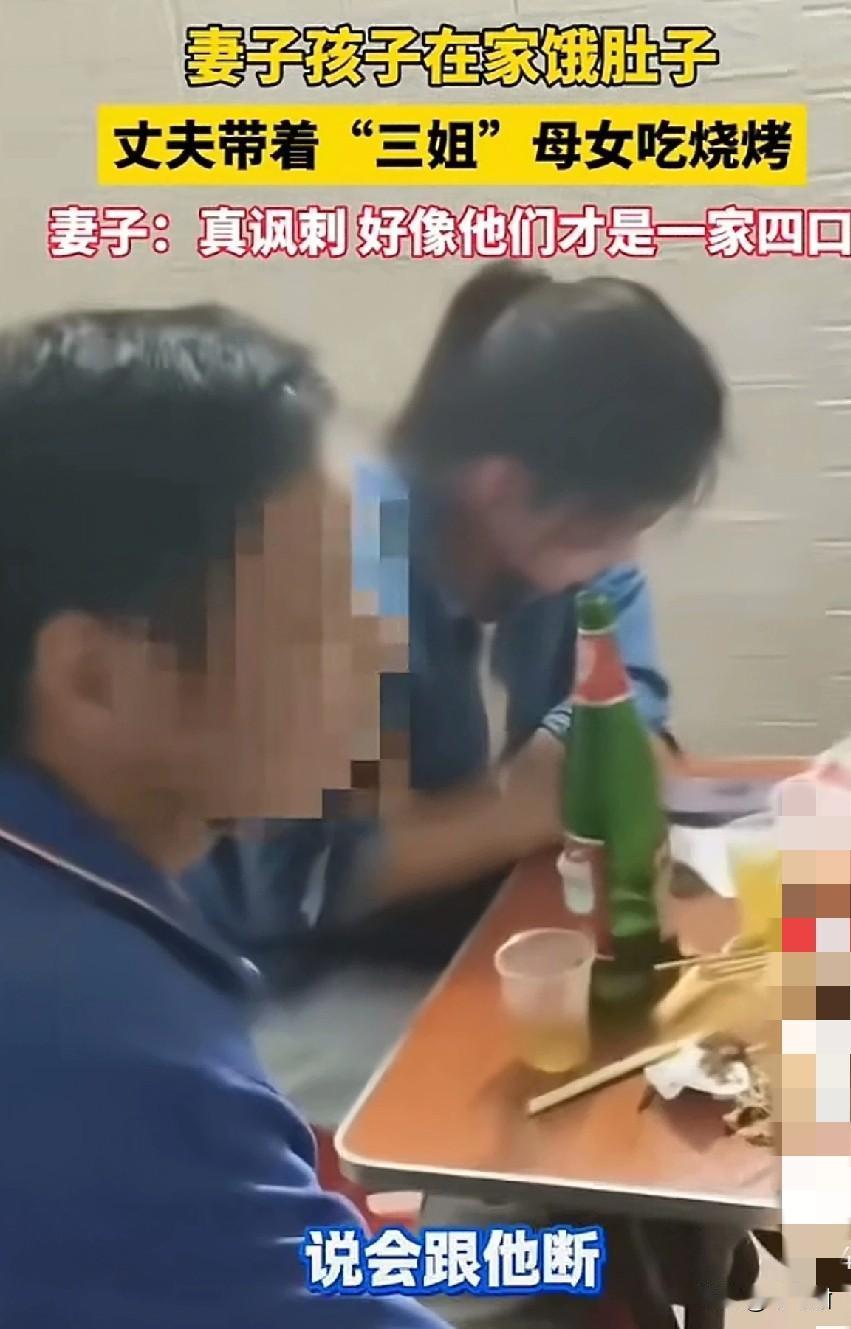 无巧不成书是怎么来的,比如这位女士,去楼下吃烧烤,看着隔壁一家三口其乐融融,满眼羡慕的时候,定睛一看,哦哟喂,“这不是我老公吗?” 老公带着小三和她的女儿,居然就在家的附近点着烧烤,喝着啤酒,是真的不避嫌啊,也根本不怕被熟人看到,这是应了那句,“家里红旗不倒,外面彩旗飘飘啊”。 现在的男的女的出轨成本太低了,小三的女儿也低头接受着来自对方的“灵魂拷问”,别人的老公,知三当三的妈,吃的津津有味的她。 男人的老婆问他为什么死活不离婚呢?自己孩子还在家里没饭吃,转头带着小三和她的女儿在外面吃的欢喜,这男人怎么这么傻,养大别人的娃,跟他有毛的关系吗?多尔衮都养不熟的儿,他还想养大别人的娃? 穿着工作服的男人,看着老实本分,却也享有着齐人之福啊,家里免费的保姆,外面漂亮的情人,很想问他一句,兄弟,你那点工资,养得起两个家庭,两边的娃吗? (图片来自网络视频)