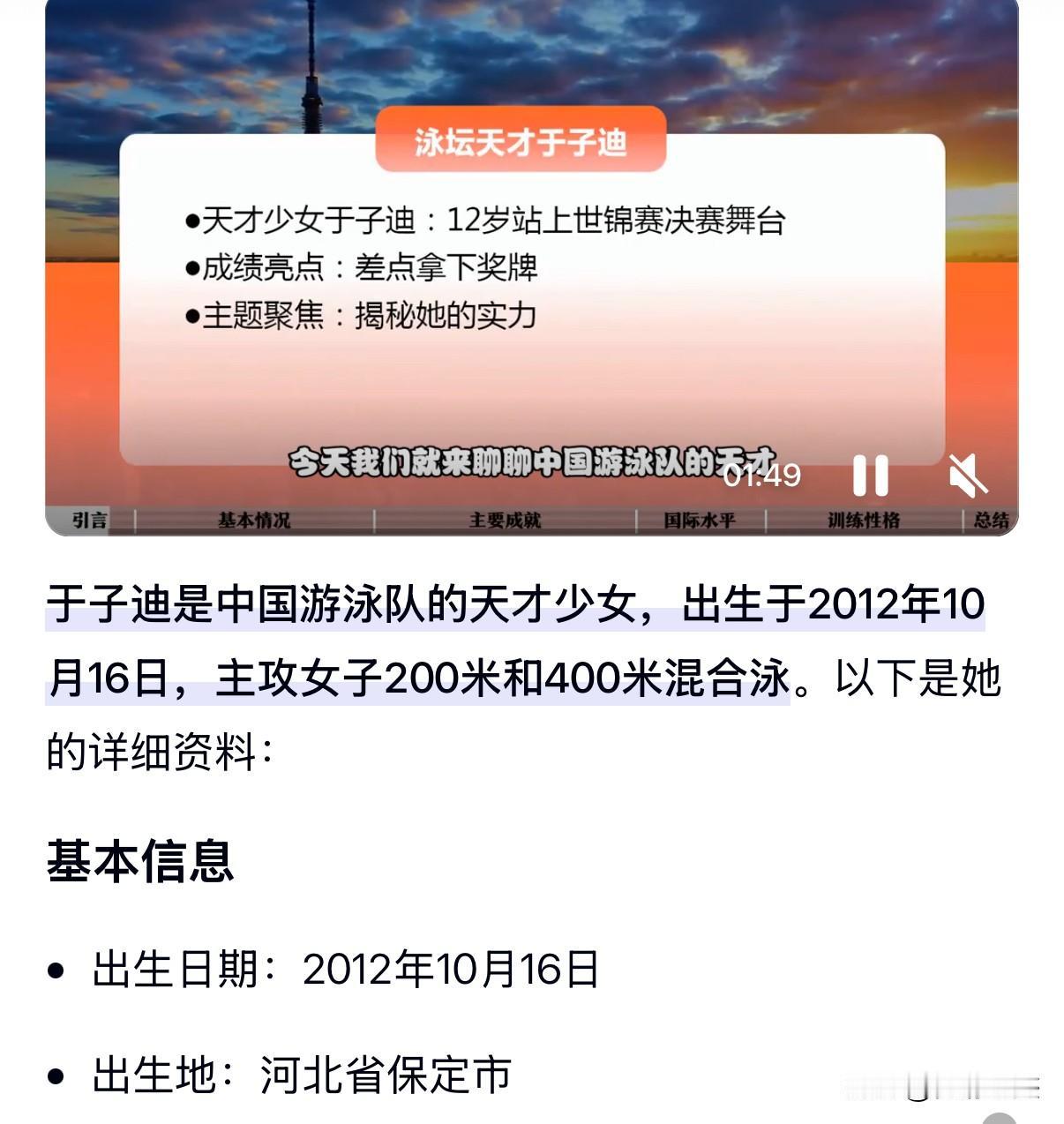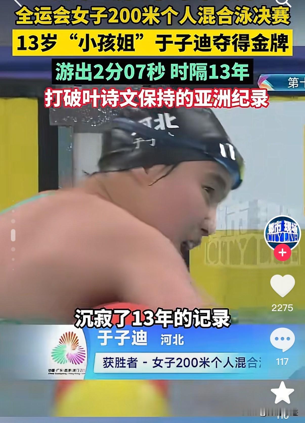 保定体育又出一“天才少女”,央视新闻专门报道,这一游打破了叶诗文保持了十三年的亚洲纪录! 在刚刚全运会上结束的女子二百米混合泳决赛中,网友口中的“小孩姐”于子迪横空出世一举夺冠! 百度了一下才知道,原来是保定的,不得不说保定体育强市的名号不是盖的,真是长江后浪推前浪。 据说他夺冠的那个成绩足可以拿到伦敦奥运会的金牌,也是世界第九好成绩,关键是她才13岁啊,或许这就是妥妥别人家的孩子吧! 如果按照这个势头发展,超越前辈们的成就也不在话下,没准还真有希望成为女版的“孙杨”也未可知,大家觉得呢?