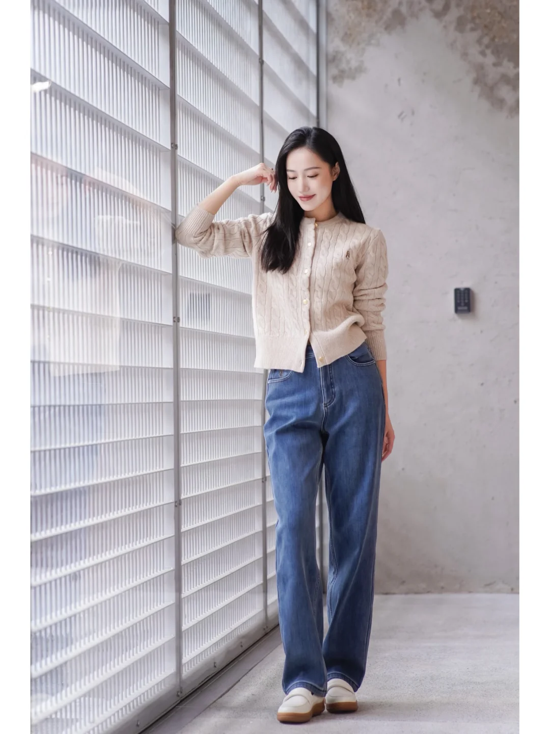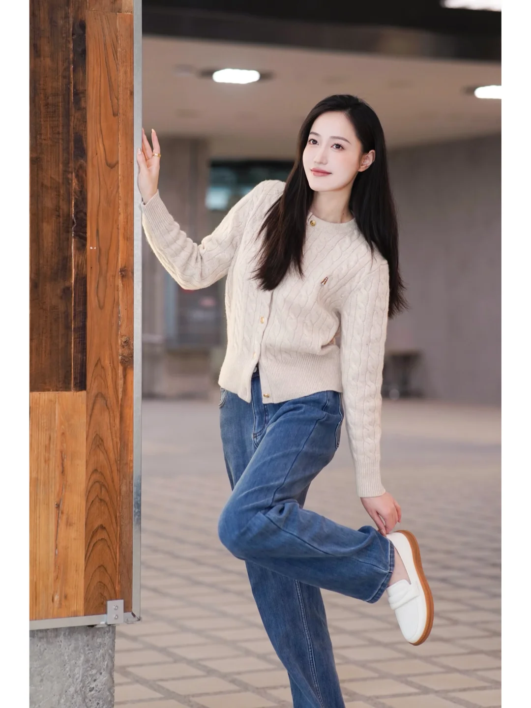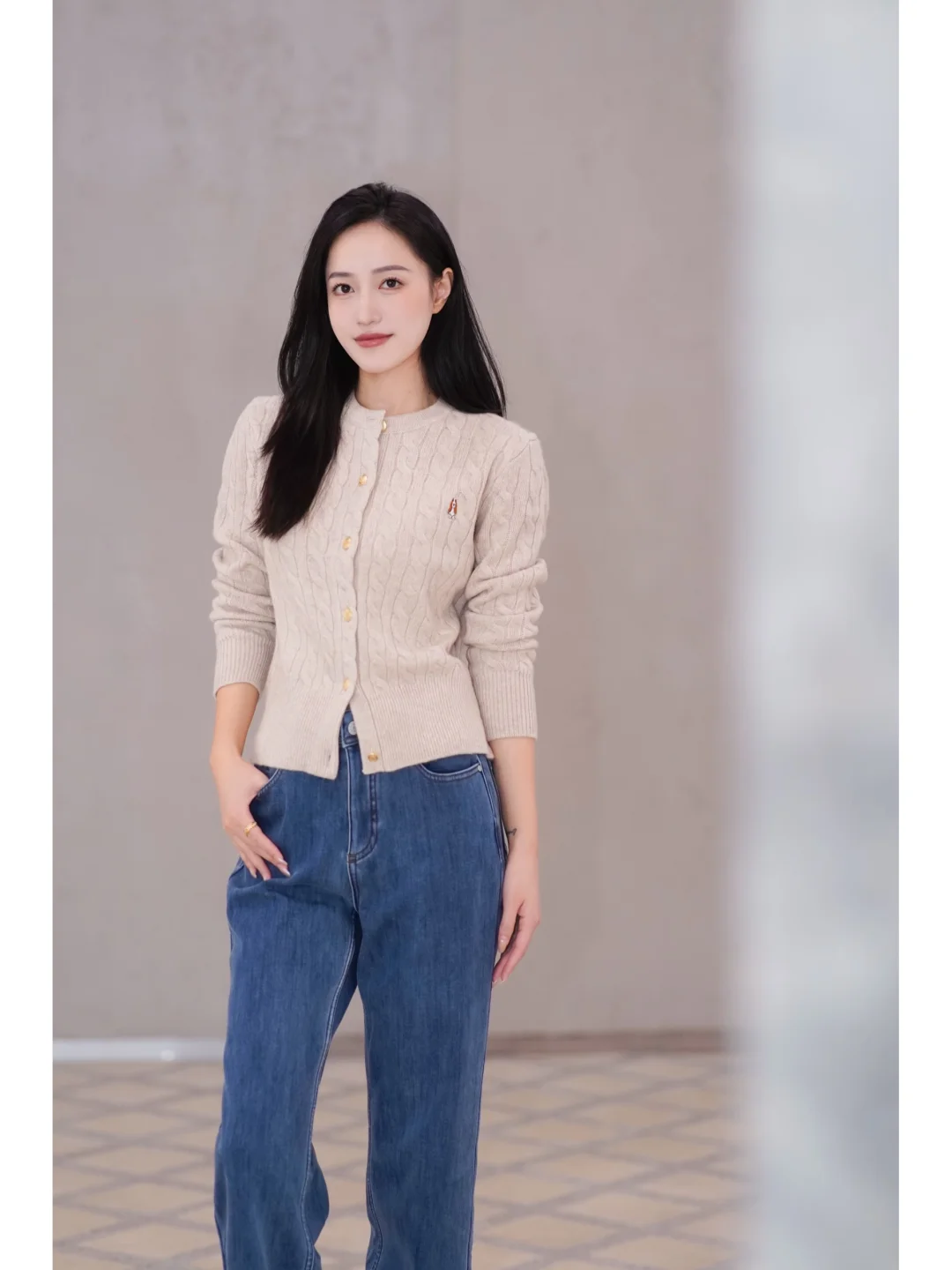 暇步士这件奶茶色绞花针织开衫是秋日氛围担当