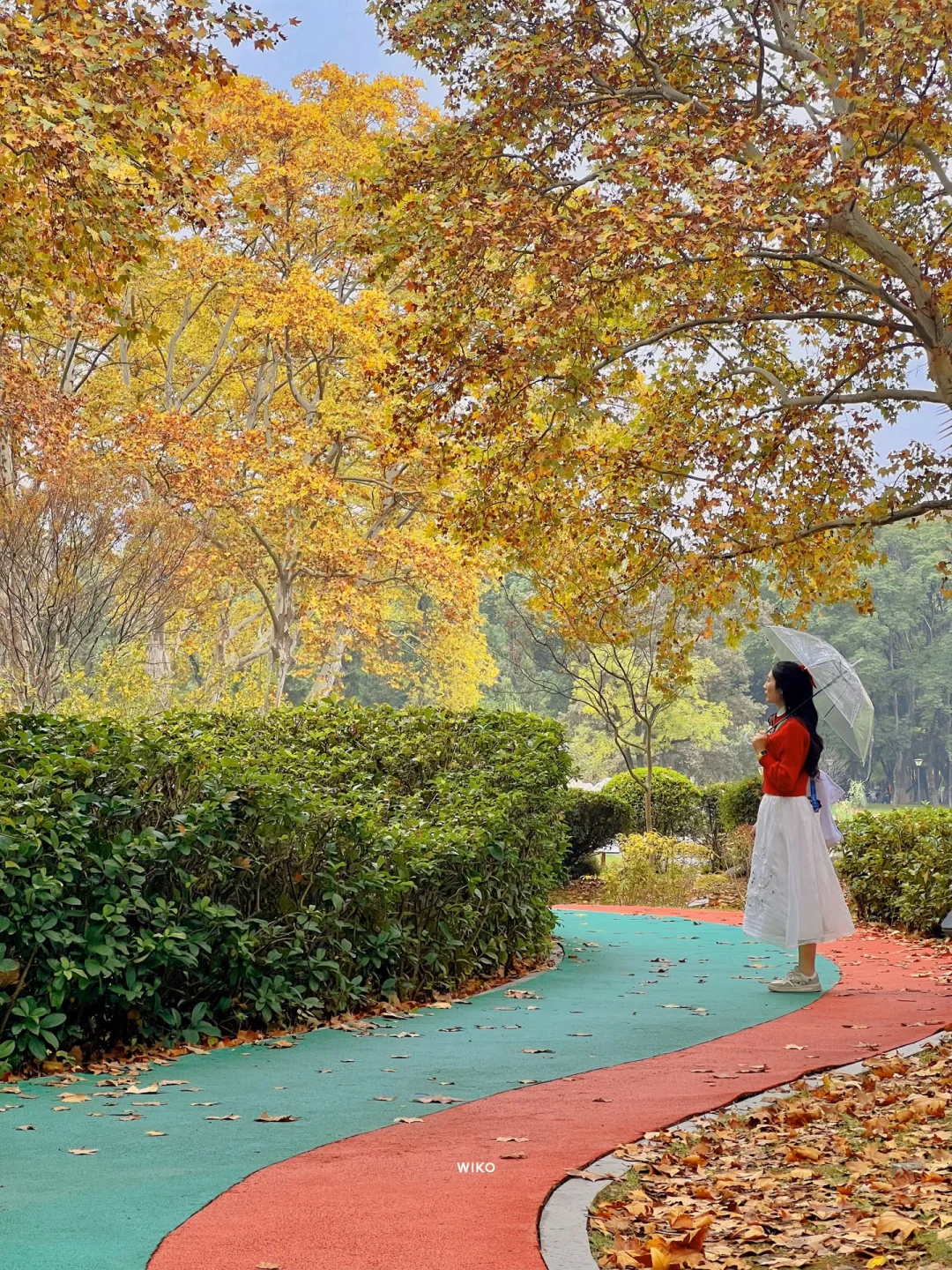 2号门进→银杏大道(拍照)→鸽子广场(喂鸽子)→枫叶谷(深度拍摄)→湖边游船(休闲)→水杉林(日落打卡)→西门出