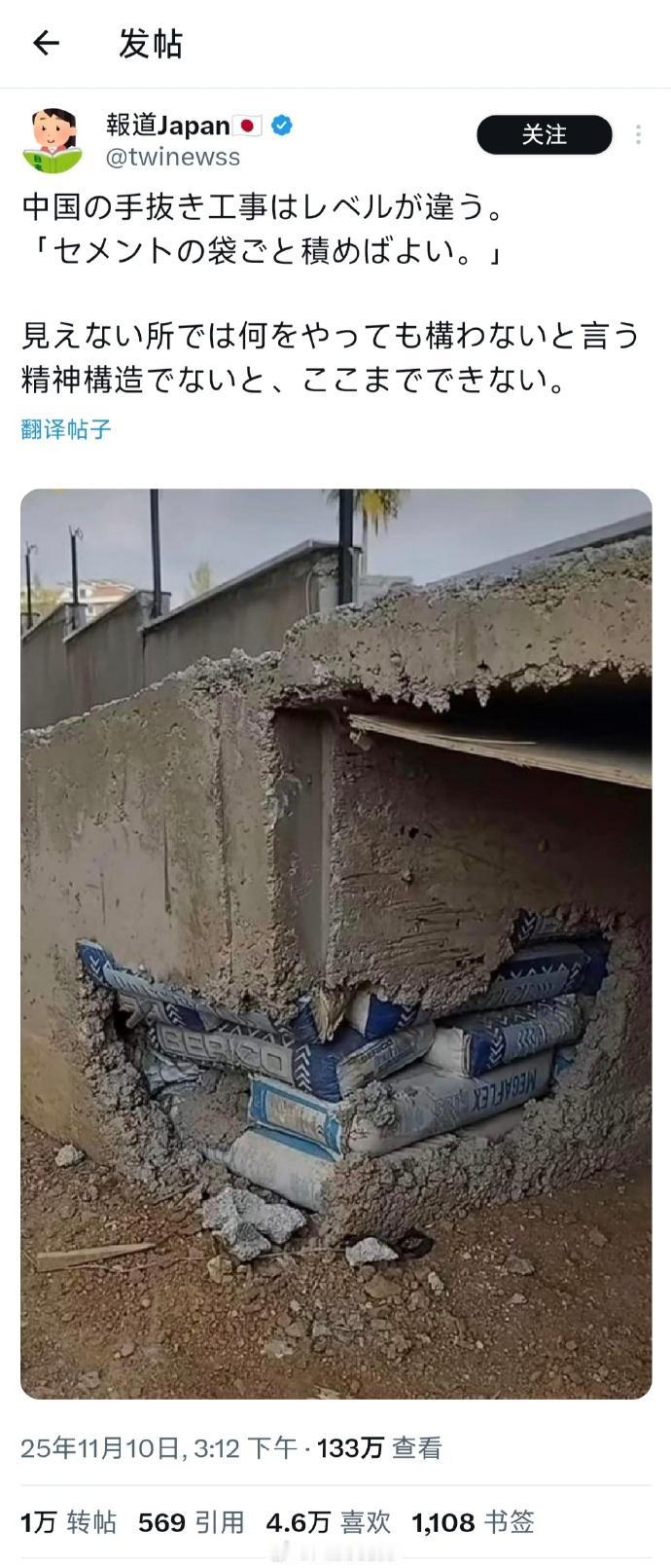 近日,一位日本博主发了一张照片,说中国人直接把水泥袋子砌在墙里,这样造假的国家还有什么希望,然后说中国全是豆腐渣工程。 这件事在日本有上万的转发,这个数字虽然对我们来说不太多,但对于小日子这个国家的人口数量来说,已经算得上是顶流了。 于是,中国又一次在日本造成轰动,全民狂欢唱衰中国。 唉,我还是对他们有一点同情的,就和湾湾一样,宁肯被假消息洗脑自嗨,也不愿意抽出哪怕十秒钟来看看图片,更不用动一点脑子做最简单的分析。 就像一群完全疯癫无法停下来的蟑螂。 只要看看这个水泥上的商标,就知道不是中国货,再查一下,就知道是土耳其的事。 难道中国这个基建大中,水泥也要用国外的?? 一方面军演针对中国,一方面用假消息给国人洗脑,总有一天,他们会为自己的愚蠢付出代价!