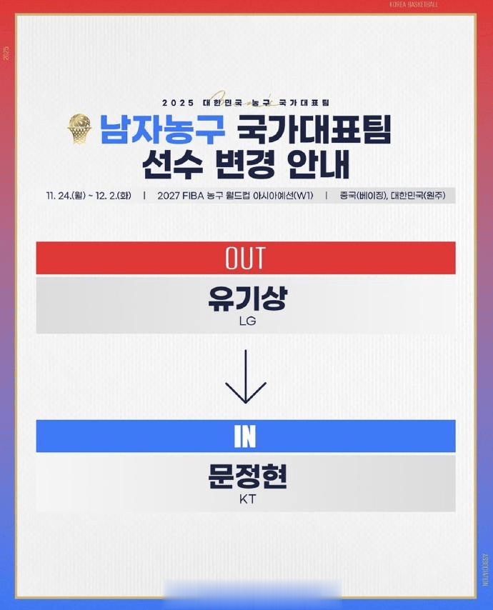 “世预赛对手动态,韩国男篮12人名单更换了一人,柳基相因伤被文正贤替换。