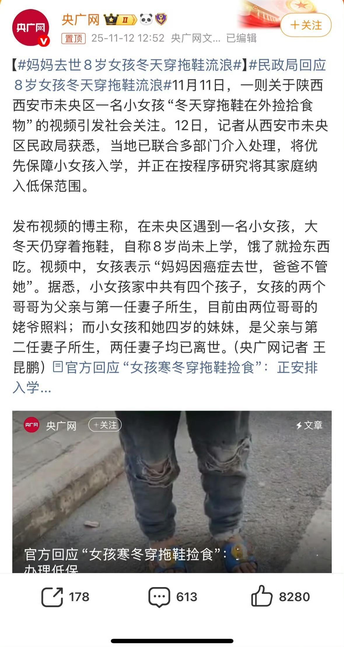 破防了[流泪]!刷到西安这名8岁女孩的视频,心瞬间揪紧了!大冬天的,别的孩子裹着羽绒服上学,她却光着脚穿拖鞋在街头捡东西吃,小声说“妈妈得癌症走了,爸爸不管我”,看得人鼻子一酸。 更让人心疼的是,她还有个4岁妹妹,姐妹俩全靠家里老人勉强照看,本该坐在教室里读书的年纪,却连件暖和衣服都没有。但好在人间有大爱,视频曝光后,民政、妇联、教育局立刻连夜介入,不仅要尽快送她返校上学,还在办低保,要给孩子们兜底保障,这波暖心操作必须点赞! 你觉得该怎么更好守护这类困境儿童?如果遇到这样的孩子,你会怎么做?评论区聊聊你的想法,一起为女孩祈福,愿她往后都是暖阳! 困境儿童帮扶 人间有爱 暖心正能量