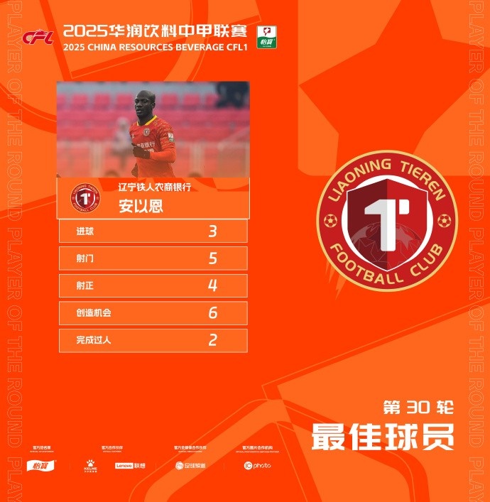 直播吧11月12日讯上演帽子戏法的辽宁铁人球员安以恩,当选为中甲联赛第30轮最佳球员。