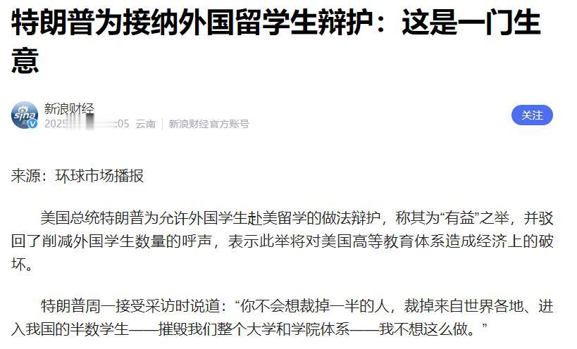 福克斯主持人追问特朗普:“为何不减少中国学生赴美留学的人数?”特朗普回答:“裁掉来自世界各地、尤其是中国进入我国的学生,这将摧毁我们整个大学和学院体系!” 特朗普这话不是随口说说,背后藏着美国高校体系那点不能说的秘密——他们早就把中国学生当成了维持运转的“提款机”和创新引擎的“燃料库”。 2023至2024学年在美国高校就读的国际学生人数达到110万,其中中国学生就占了27.7万,差不多每四个国际生里就有一个来自中国。 这些学生带来的可不止是书本和行李箱,更有真金白银的经济贡献,光这一学年国际学生就为美国经济注入了近440亿美元,分摊到中国学生身上就是一笔不小的数目。 像加州这种国际学生扎堆的地方,近14.1万名国际学生贡献了64亿美元,要是突然把中国学生这块拿掉,当地高校的财务报表恐怕得立刻出现个大窟窿。 更现实的是,美国高校尤其是公立大学,早就把国际生学费当成了“摇钱树”。通常国际生的学费是本土州内学生的三倍以上,中国学生大多集中在学费高昂的商科、工程等专业,等于给学校送来了行走的“教育投资”。 得克萨斯州近9万名国际学生贡献25亿美元,马萨诸塞州8.2万名国际学生贡献39亿美元,这些数字背后都是高校的运营经费、奖学金发放和科研设备采购的保障。 要是真按福克斯主持人说的裁掉中国学生,估计不少大学的校长得连夜开会讨论怎么缩减预算,说不定连图书馆的开馆时间都得缩短。 而除了钱,中国学生还是美国科技领域的“隐形功臣”。硅谷从事AI相关工作的华人工程师占了半壁江山,这些人里相当一部分都是从美国高校的STEM专业毕业的。 STEM领域一直是中国学生的热门选择,他们不仅在课堂上拿高分,更在实验室里帮着导师搞科研、在初创公司里敲代码。像Zoom的创始人袁征就是典型的中国留学生代表,从斯坦福毕业后果断留美创业,最终打造出全球知名的视频会议软件。 如果减少中国学生,美国高校的科研实力会直接打折扣,毕竟少了这么多优质的“科研劳动力”,实验室里的项目进度都得慢下来。 更别说美国一直把高等教育当成软实力的重要工具。乔治敦大学就曾直言,国际学生是美国最重要的软实力资源,这些学生在美国待上几年,回国后不管是从政还是经商,都会对美国抱有更友好的态度。 中国学生数量多、分布广,自然成了这种“文化输出”的重点对象。民主党参议员珍妮·沙欣也承认,国际学生是外交和软实力中最有力的工具之一。 要是把中国学生赶走,不仅少了一群潜在的“美国文化代言人”,还会让美国高校失去多元文化的标签,到时候全球顶尖学生可能会转而去英国、澳大利亚留学,美国“教育超级大国”的招牌就得褪色。 说到底,特朗普心里跟明镜似的,裁中国学生看似是“限制外来者”,实则是在断美国高校的“活路”。钱袋子要瘪,科研实力要降,软实力也要受损,这种赔本买卖换谁都不会做。 高校体系是美国的金字招牌,而中国学生就是这块招牌上不可或缺的装饰和支撑,真要把这部分抽走,招牌能不能立住都成问题。 所以特朗普才会急着反驳,不是他对中国学生有多友好,而是他清楚地知道——没了中国学生,美国大学体系还真扛不住。
