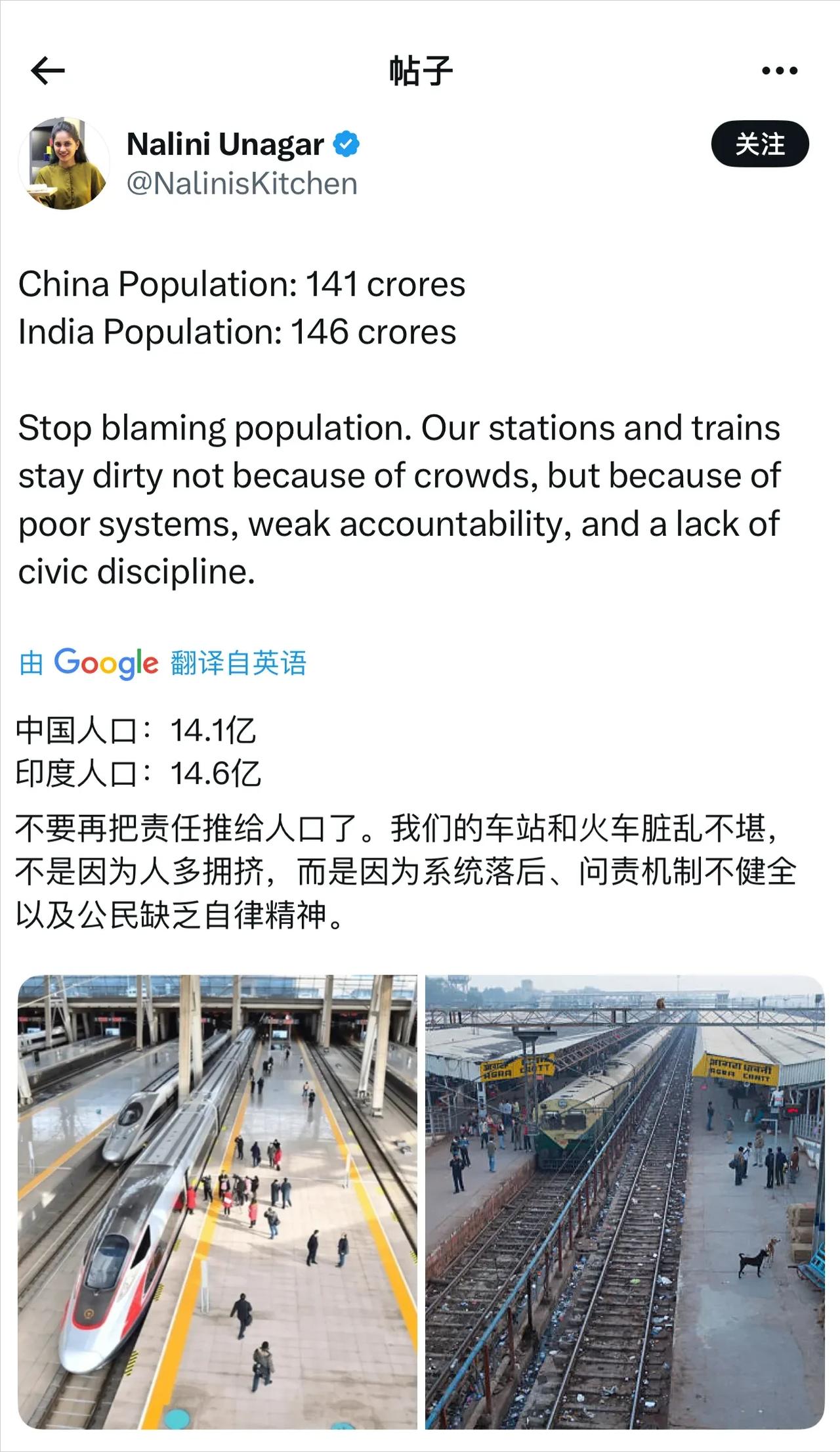 一个印度人的反思,只是不知道这个反思莫迪能不能看到。 这位在X平台发声的印度网民说得确实在理,中国14.1亿人口,印度14.6亿人口,数字上的微弱差距根本不足以成为车站和火车脏乱不堪的挡箭牌。真正的症结,就像他说的那样,藏在系统落后、问责机制不健全和公民缺乏自律这三个环环相扣的问题里。 印度的铁路网络堪称“百年古董”,其铁道部2015年的评估报告就指出,每年有大约4500公里铁轨需要更新,但资金缺口让这项工作进展缓慢到几乎停滞。 2017年的时候,一项总额150亿美元的安全大修计划,居然因为国家钢铁公司无法提供合格铁轨而被迫延迟,连最基本的硬件维护都如此捉襟见肘,更别提清洁设施的配备了。 新德里车站里,乘客做饭、喂牲畜、甚至在候车区洗澡的场景早已不是新鲜事,这些混乱背后是基础设施的全面溃败——垃圾桶数量不足、排污系统堵塞、清洁工具陈旧,仿佛时间在这个国家的铁路系统里按下了暂停键。 问责机制这方面的缺失更是让脏乱问题雪上加霜,班加罗尔今年10月推出的“垃圾倾倒节”很能说明问题,市政部门把垃圾倒回违规者家门口并罚款2000卢比,首日就处理了200户家庭,可这样的创新惩戒方式恰恰暴露了传统管理的失效。 早在2012年,印度铁道部就曾宣布对火车站乱扔垃圾、随地大小便等行为罚款500卢比,但政策执行向来是“雷声大雨点小”,既没有明确谁来监督罚款流程,也没有规定工作人员失职该如何追责。 结果就是告示牌贴了不少,违规行为却愈演愈烈,今年前三季度班加罗尔顽固性垃圾违规案件同比激增45%,这种“光说不练”的管理模式,让任何清洁计划都沦为了形式主义。 更讽刺的是,2016年政府承诺5年内投资1300多亿美元改造铁路,可资金究竟用在了何处,是否真正投入到卫生设施建设中,至今没有公开透明的监督报告。 公民自律的缺失则是压垮骆驼的最后一根稻草。世界银行数据显示,2022年印度仅有52%的人口使用安全管理的卫生设施,在印度的火车站里,吐痰、乱扔垃圾、破坏公物成了常态,甚至有人把站台当成自家后院,随意张贴海报、堆放杂物。 即便铁道部要求商贩必须携带垃圾桶自行处理垃圾,大多数人还是习惯性地将废弃物随手丢弃。这种对公共环境的漠视,与社会整体文明素养的培养不足密切相关。 而当系统无法提供便利的清洁条件,问责机制又不能形成有效约束时,公民的自律意识也难以建立。毕竟,在一个连基本卫生设施都保障不了、违规成本几乎为零的环境里,要求每个人都自觉维护整洁,本身就是一种奢望。 说到底,人口数量从来不是衡量公共环境好坏的标准。印度铁路的问题,本质上是管理体系的全面失灵——资金投入不到位、政策执行打折扣、公民行为缺引导,这三个问题交织在一起,才造就了如今脏乱差的现状。 那位网民的反思,也不知道莫迪能不能看到,这或许才是印度改变现状的决心与行动,而不是继续把责任推给无辜的人口数字。