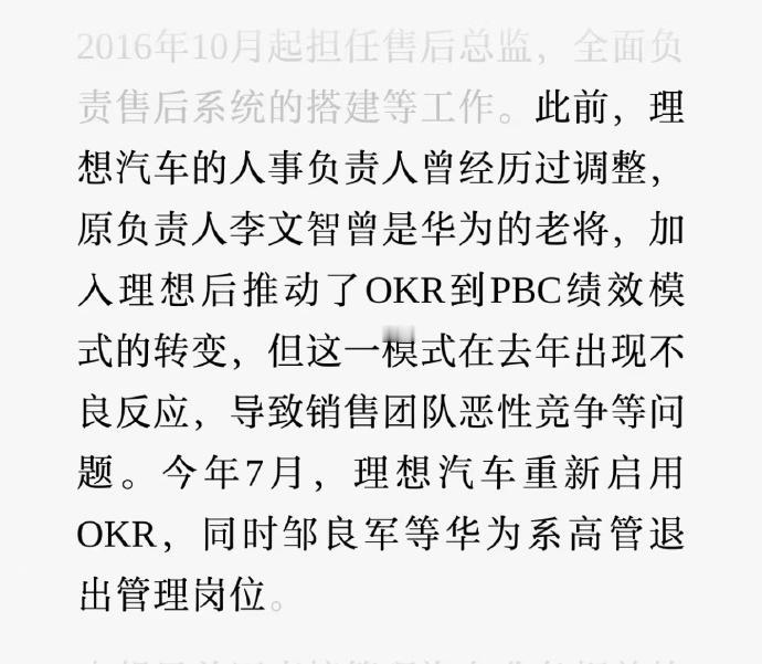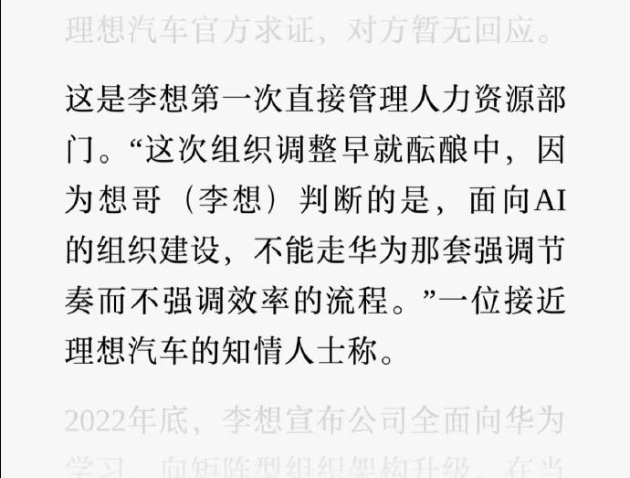 理想汽车的组织调整还挺有意思。之前学华为搞 PBC 绩效、矩阵架构,结果人力资源内部出现内耗,销售团队还搞起恶性竞争。今年不仅把 OKR 又捡了回来,邹良军这些华为系高管也退出管理岗位了。现在李想直接管人力,要搞适配 AI 的组织建设,觉得华为那套流程太讲究节奏,效率跟不上。说白了,理想这是在试错中找适合自己的路子,毕竟照搬别人的经验,不一定能走通自己的道。