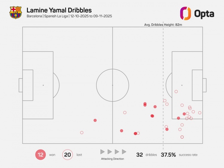 Opta指出,10月12日以来,亚马尔联赛尝试过人32次,与图卢兹球员博霍并列五大联赛最多,过人成功率37.5%。