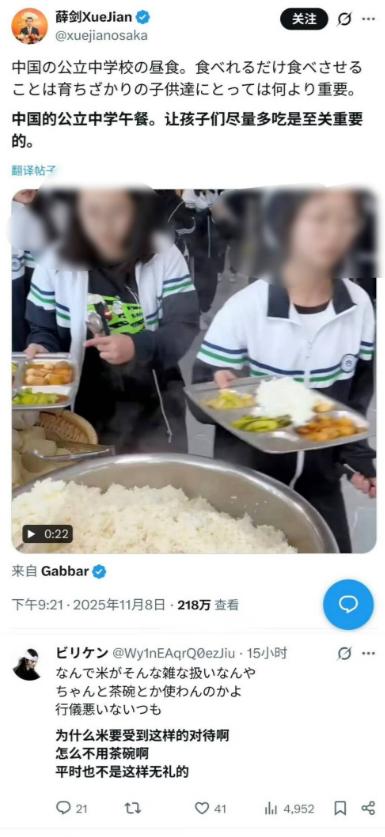 日本网民围攻中国总领事,叫嚣“再打一场甲午海战”,却被一段视频搞破防 这事说起来,根本不是咱们中国主动挑事,全是日本一些政客先越界挑衅引出来的。咱们都知道,台湾问题是中国的家务事,外人半点儿插不上嘴,可日本首相高市早苗偏要跳出来刷存在感。她在国会里公开说,要是台海发生冲突,就是日本的“存亡危机”,到时候日本说不定会动用所谓的“集体自卫权”——说白了,就是明着放话要武力插手台湾问题。 这话传到中国驻大阪总领事薛剑耳朵里,咱们外交官肯定不能惯着这种干涉内政的行为。薛剑总领事就在社交媒体上强硬回应,大概意思是“对于这种乱伸过来的脏脑袋,就得干脆利落地砍掉,让他们想清楚后果”。 这话本来是针对日本政客的错误言论,没成想直接戳爆了日本右翼网民的神经。他们像是被踩了尾巴的猫,一窝蜂跑到总领事的账号下围攻谩骂,甚至喊出“再打一场甲午海战”这种不着边际的话,还叫嚣着要把咱们的总领事驱逐出境。 这些日本网民之所以拿甲午海战说事儿,无非是想翻出一百多年前那点老黄历给自己壮胆。在他们眼里,好像还活在那个靠着坚船利炮欺负中国的年代,压根没看清现在的中日早就不是当年的样子了。更有意思的是,连美国驻日大使都跟着凑热闹,转发总领事的发言添油加醋,说咱们“面具掉了”,故意把正常的主权捍卫说成是“威胁”,说白了就是想帮着日本给咱们施压。 就在这群日本网民闹得最凶的时候,薛剑总领事没跟他们争辩半句,就发了一段短短几十秒的视频,结果直接让这群叫嚣的人彻底破防。大家肯定好奇,这到底是段什么视频?说出来你可能都觉得意外,既不是咱们的军舰演习,也不是什么外交声明,就是一段中国中学生排队打午餐的日常画面。视频里,穿着校服的孩子们排着整齐的队伍,食堂的师傅一勺勺把白花花的米饭盛到不锈钢餐盘里,旁边还有冒着热气的炒菜,孩子们拿着餐盘有说有笑地找座位吃饭,画面特别朴实平常。 可就是这段咱们看着再普通不过的视频,到了日本网民眼里却成了“暴击”。他们的评论瞬间跑偏,不再喊着打海战,反而揪着餐盘较劲,说“怎么能用不锈钢餐盘装米饭?必须用茶杯才是对大米的尊重”。这种莫名其妙的指责,明眼人一看就知道是没话找话,本质上就是被视频戳到了痛处,只能拿这种小事撒气。 为啥一段午餐视频能让他们破防?核心就是这段视频不经意间暴露了两国的民生底气,打了那些叫嚣者的脸。日本这些年经济一直不景气,普通老百姓的日子过得并不轻松,粮食自给率其实很低,很多家庭吃饭都得精打细算。 他们心里清楚,真要论起保障老百姓的温饱,现在的中国早就甩他们几条街了。咱们国家不仅粮食年年丰收,2024年的总产量都突破1.4万亿斤了,而且从孩子的午餐就能看出来,咱们的民生保障踏踏实实,孩子们不仅能吃饱,还能吃好。 反观他们叫嚣的“甲午海战”,当年日本能打赢,很大程度是因为那时候的中国积贫积弱,老百姓连肚子都填不饱,根本没力气谈国防。可现在呢?咱们14亿人都能安安稳稳吃饱饭,国家有足够的实力保护每一个人,这才是最硬的底气。 那些日本网民心里其实比谁都清楚,现在的中国根本不是他们能招惹的,所以只能翻出百年前的旧账给自己打气。结果这段午餐视频,一下就把他们的虚幻泡沫戳破了——连孩子们的午餐都这么扎实,这样的国家怎么可能被轻易拿捏? 更讽刺的是,他们一边喊着要“开战”,一边连咱们用什么盘子盛饭都要管,这种前后矛盾的表现,恰恰说明他们已经理屈词穷。其实日本网民与其在网上对咱们的外交官叫嚣,不如好好问问他们的首相,为啥放着国内的民生问题不管,非要跑到中国的内政里搅浑水。 咱们中国从来不怕挑衅,也不屑于跟一群活在过去的人争吵,那段午餐视频就是最有力的回应:我们现在的日子过得安稳踏实,有足够的实力守护自己的国家和人民,这就是最硬的底气,任何虚幻的叫嚣都不值一提。