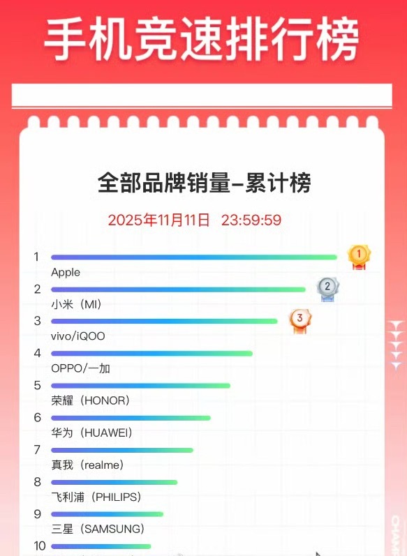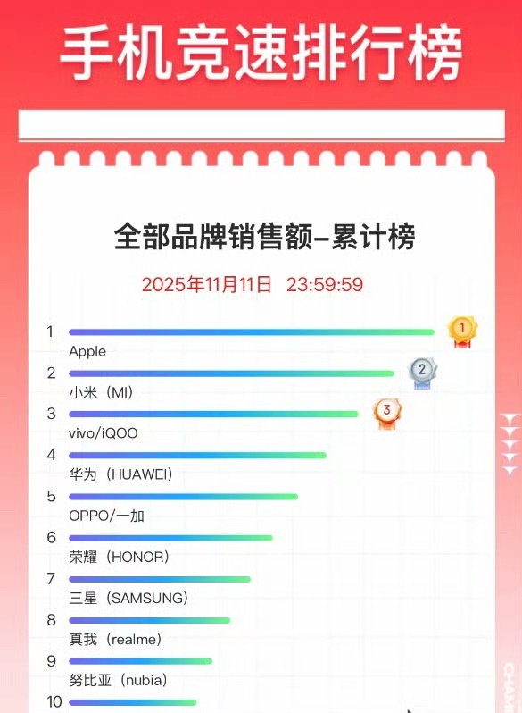 京东双11成绩单:总销量前三强:苹果、小米、vivo销售额前三强:苹果、小米、vivo最佳冲刺品牌:荣耀鸿蒙榜前三名:华为、华为、华为