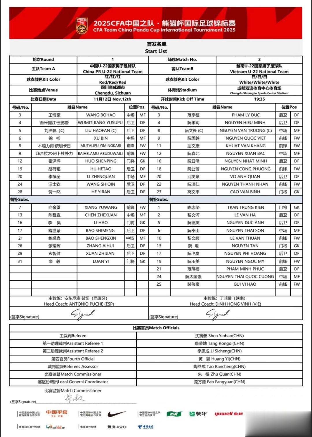 中国U22首发:12-霍深坪、4-吾米提江、5-刘浩帆、19-胡荷韬、24-汪士钦、28-贺一然、3、王博豪6-徐彬、20-李镇全、8-木塔力甫、9-拜合拉木